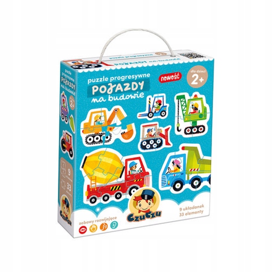 головоломці з все більшою кількістю елементів показують транспортні засоби з будівельного майданчика. У коробці міститься 9 головоломок різних елементів: 2, 3, 4, 5 і 6. Головоломки надихають багато різних ігор. Вони працюють фантастично вдома, подорожуючи та граючи разом. Це чудова ідея для перших багатоелементних головоломок для дітей. Вік 2+