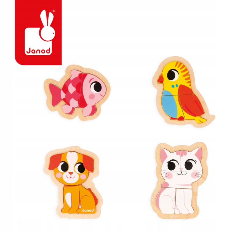 Набір дерев'яних прогресивних пазлів Pets від французького бренду JANOD складається з 4 головоломок різного ступеня складності. Пазли мають зручний розмір і форму, розміщені на дерев'яних підставках. Вони нараховують все більше і більше елементів (2, 3, 4 і 5), завдяки чому діти поступово вчаться справлятися з труднощами. На всіх пазлах яскравими кольорами зображені дружні домашні тварини: рибка, папуга, собака та кіт. Їх основи мають відповідну форму для зручності використання.