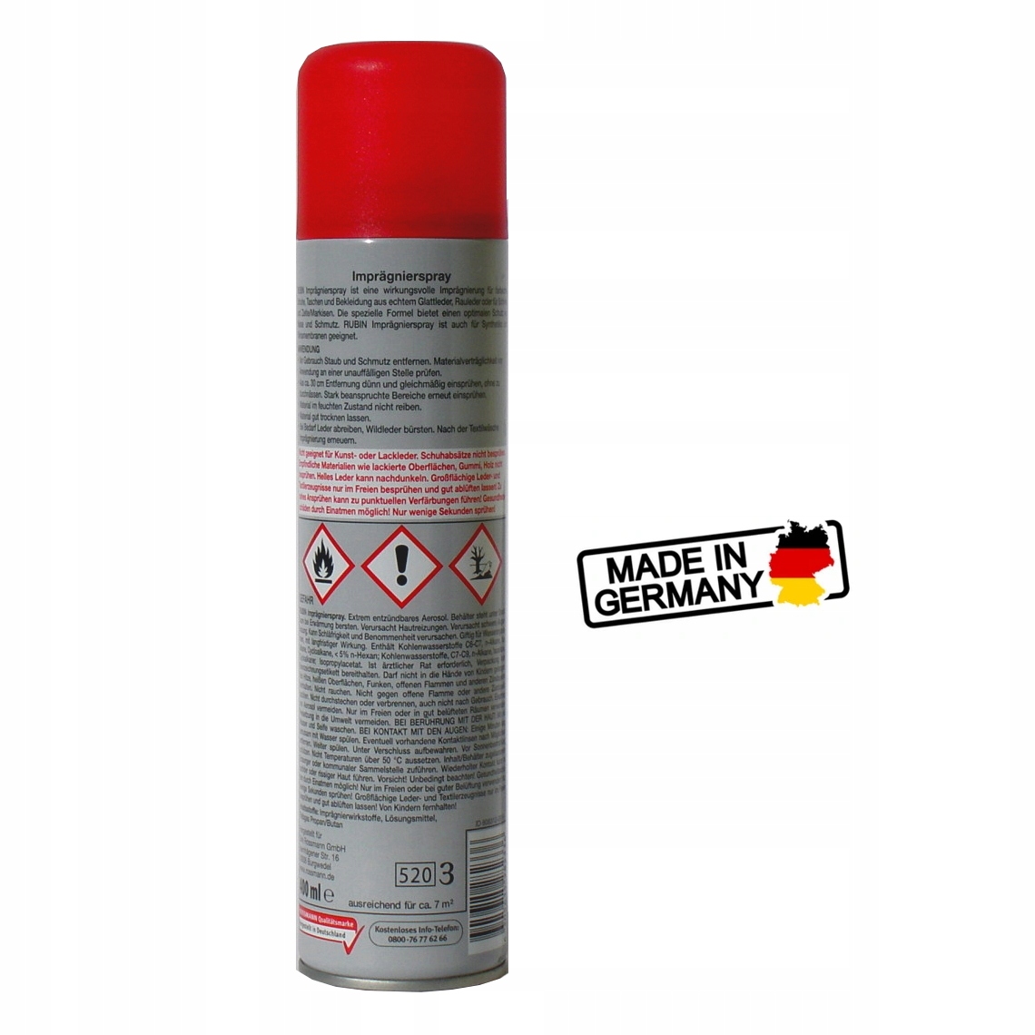 Рубіновий спрей-просочення 400 мл призначений для просочування взуття, одягу, наприклад, курток, рюкзаків і сумок, одягу з гладкої шкіри, необробленої шкіри - шкіри диких тварин, нубуку, оксамит або тканини. Спеціальна формула забезпечує оптимальний захист від вологи та бруду.