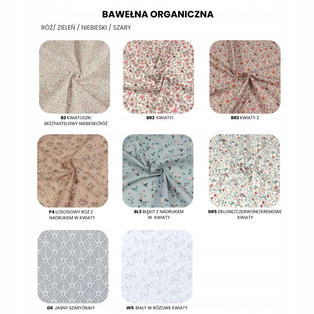 - органічна бавовна: подвійне пом'якшення, відповідає найвищим стандартам якості (GOTS). Ця тканина надзвичайно приємна на дотик завдяки довгим благородним волокнам органічно вирощеної бавовни. Тканина легка на дотик, майже струмуюча, але не прозора.