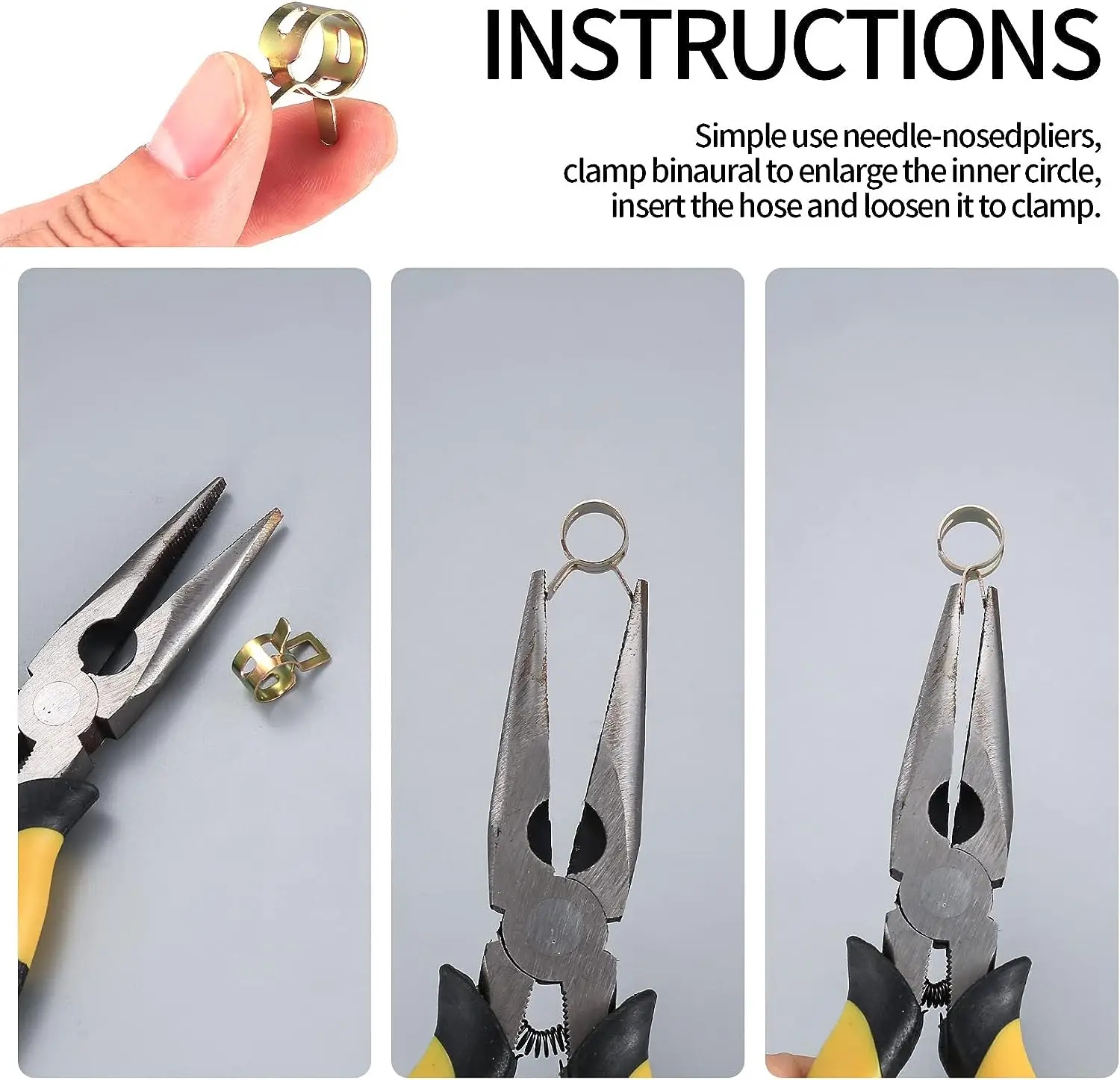 - Простий у використанні, натисніть на вуха затискача, щоб збільшити внутрішнє кільце перед встановленням на круглу трубу , потім відпустіть ручку, ви зможете затиснути шланг.< /li>