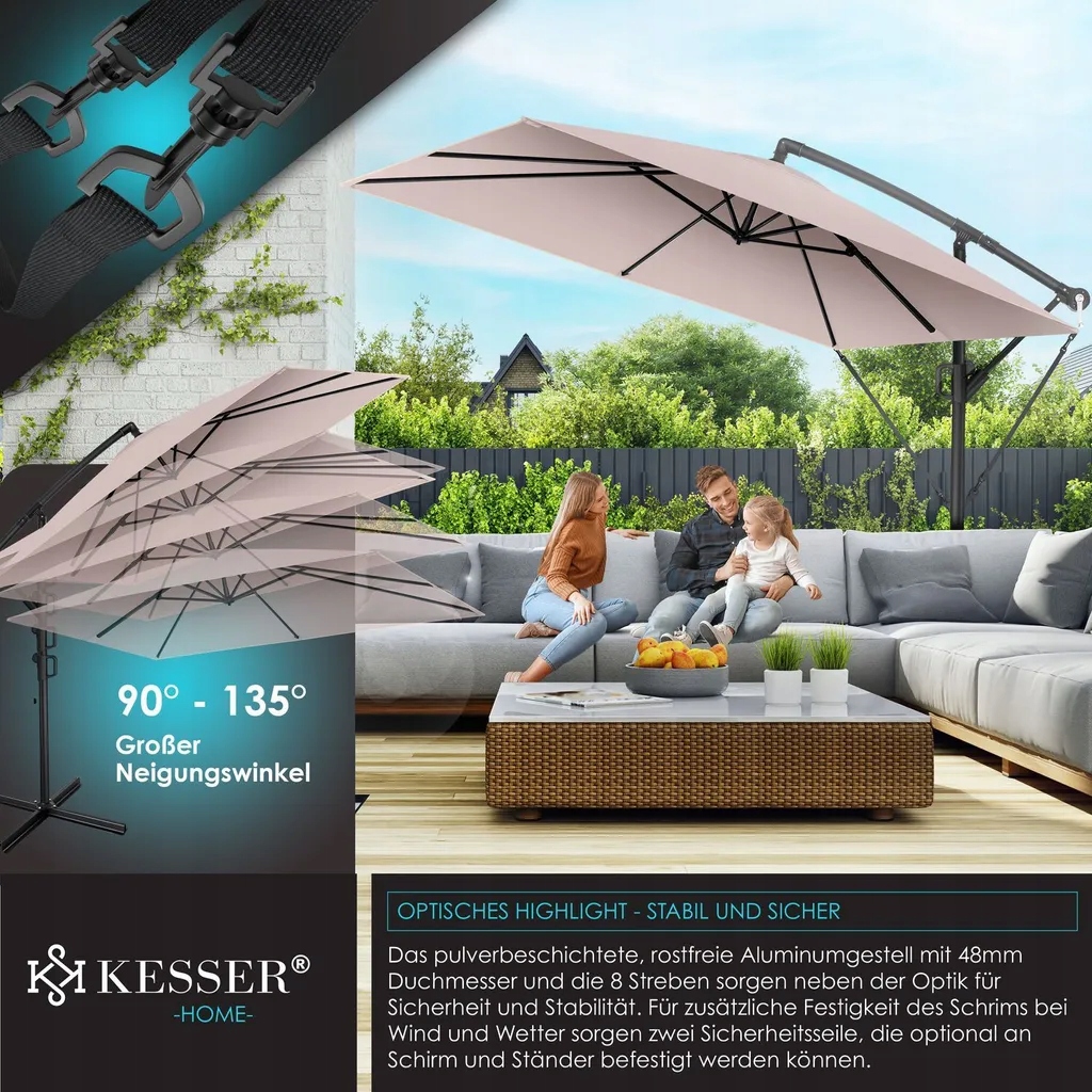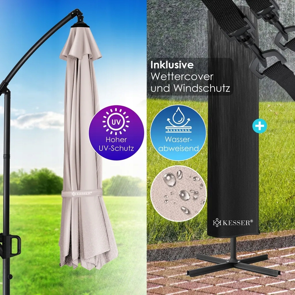 Кессерська парасолька "квадрат", що забезпечує широку тінь, з інтегрованим механізмом кривошипа та стабільною основою займає мало місця завдяки ефективній технології складання, гідрофобної чаші та нержавіючого алюмінію, включеному в набір з дощем. використовувати зовні. Завдяки великій зоні затінення понад 6 м², парасолька забезпечує багато місця та захисту для вас та ваших гостей. Будь то на терасі, в саду чи на балконі - ця парасолька буму створює приємну атмосферу і захищає від шкідливого впливу сонячного світла та негоди.