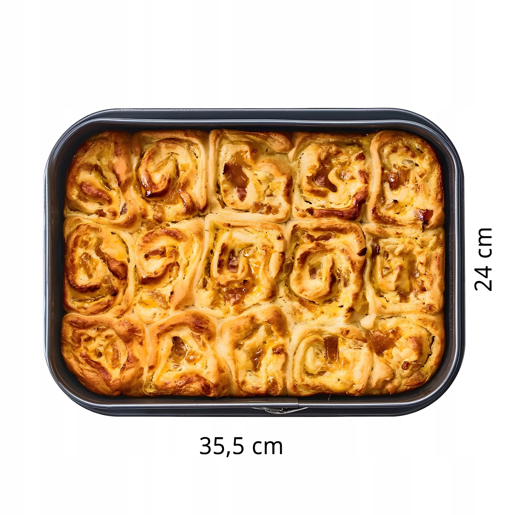 Прямокутна форма тіста була виготовлена з вуглецевої сталі з ненаустичним покриттям . Ця суцільна конструкція забезпечує тривалий термін міцність і стійкість до подряпин . Покриття, що наносить, гарантує, що тісто не прилипає до форми, що значно полегшує його видалення та очищення. Завдяки цьому спалювання стає простішим та ефективнішим.