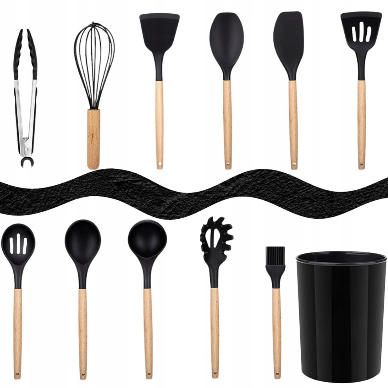✅ Весь набір складається з 12 елементів. 11 посуду та ємність для посуду. Інструмент, який використовується для чогось іншого. Є лопатки, черпаки, збирач макаронних виробів, віночок, одяг, щипці та щітка.