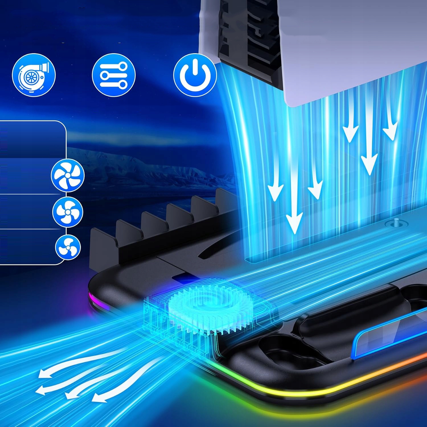 Підставка PS5 оснащена потужним великим турбовентилятором із трьома налаштуваннями швидкості: 1-ша, 2-га та 3-я (1-ша швидкість: 4500 об/хв ± 200) об/хв, 2 швидкість: 4700 об/хв ± 200 об/хв і 3 швидкість: 5000 об/хв ± 200 об/хв). Це забезпечує оптимальне охолодження консолі, подовжуючи термін її служби та покращуючи продуктивність.