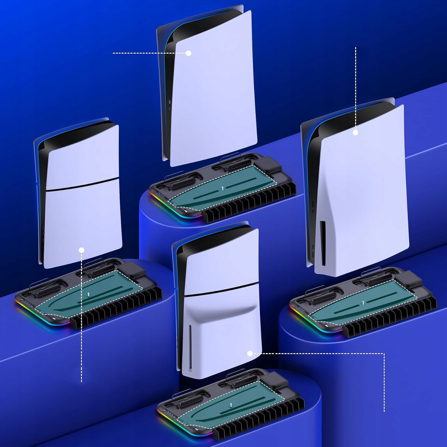 Ця підставка PS5 сумісна з останньою тонкою консоллю PS5 та забезпечує оптичне та цифрове охолодження (набір включає дві змінні пластини, одну для старішої версії PS5 і другої для нової PS5 slim). Підставка оснащена кріпильними гвинтами для надійної фіксації, тож ви можете грати, не турбуючись про правильне встановлення.