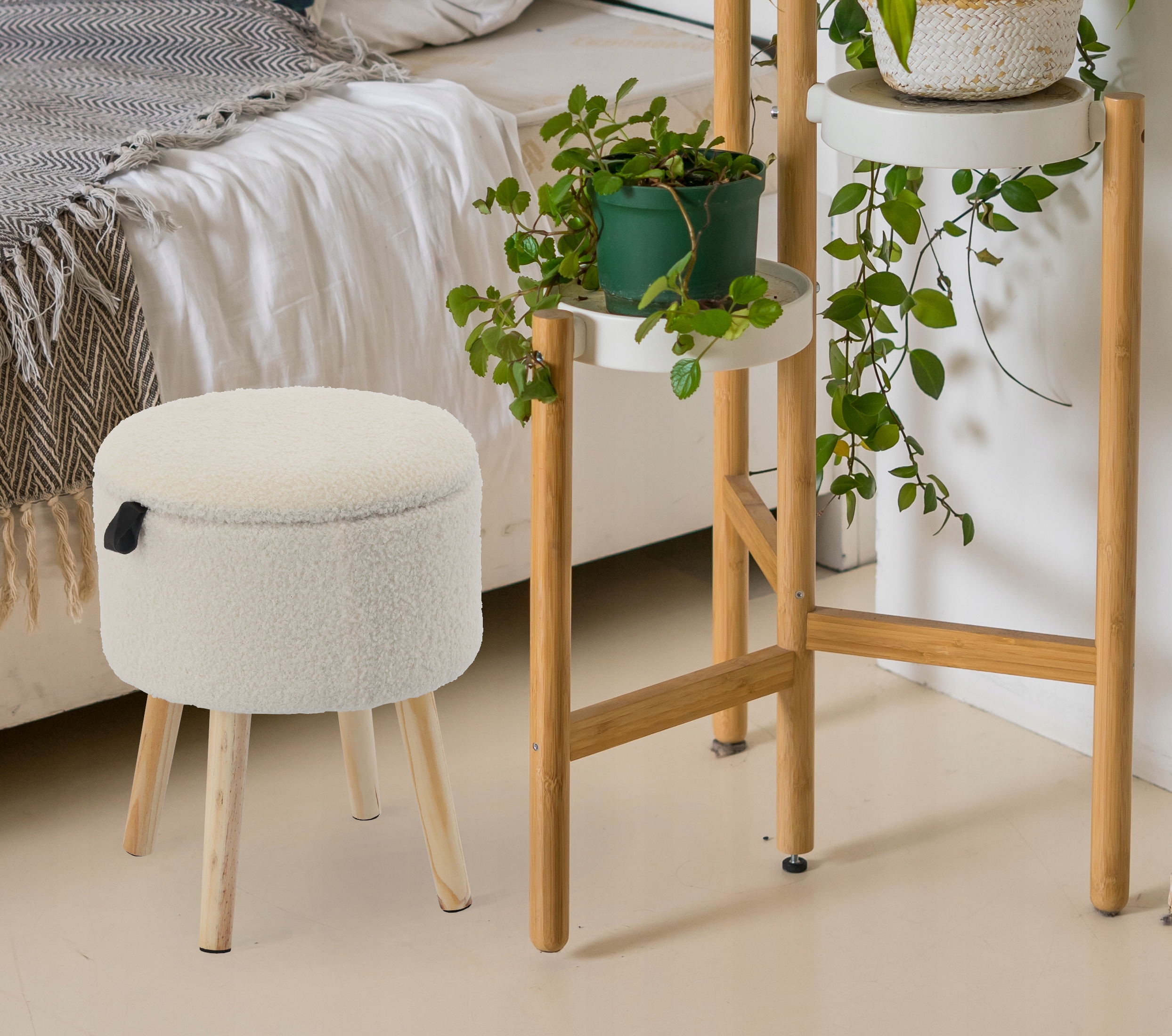 ПУФ КРУГЛИЙ НА ДЕРЕВ'ЯНИХ НІЖКАХ 30х30х28 СМ З МІСЦЕМ ДЛЯ ЗБЕРІГАННЯ, БІЛИЙ
