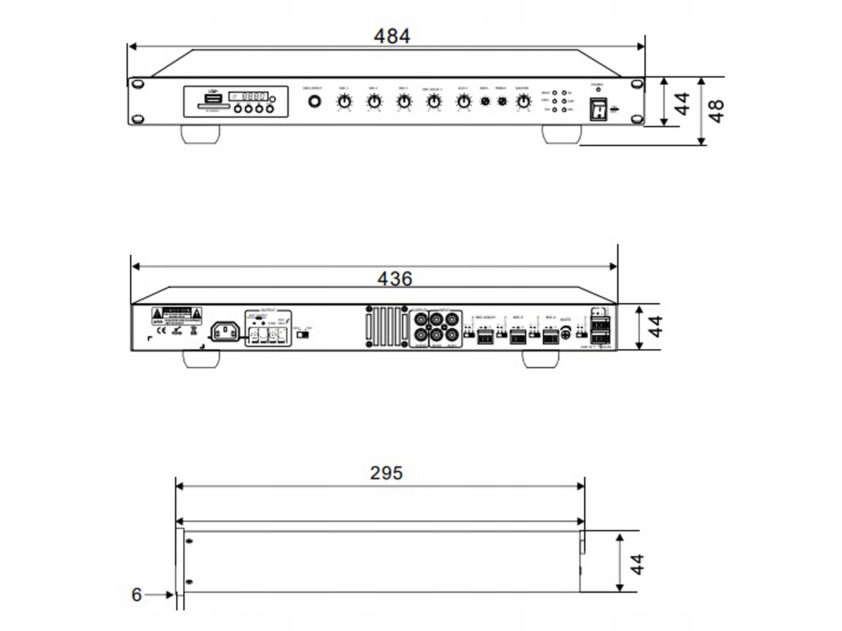 ● Підсилювач мікшування 120 RMS ● MP3/USB/SD-плеєр ● FM-тюнер з функцією автоматичного програмування радіостанцій ● Приймач Bluetooth ● Безтрансформаторні виходи 70В і 100В ● Підсилювач потужності класу H ● Двохточкове керування тембром, загальне для входів ● Вхід пріоритету EMC типу VOICE ● Встановіть контакт, вимкнувши всі входи, крім електромагнітної сумісності ● Входи MIC2-MIC4 з перемиканням чутливості з опцією PHANTOM ● Порядок пріоритету EMC > MIC1-MIC4 > AUX1-2 > MP3 ● Вхід аварійного живлення 24 В ● У комплект входить пульт для керування модулем MP3/TUNER/Bluetooth ● Корпус стійки 19"/1U