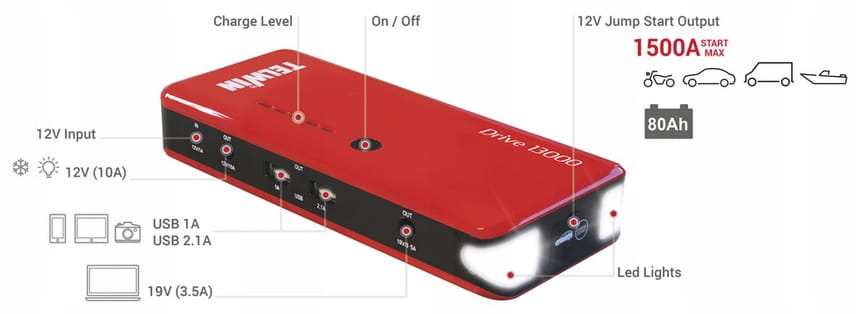 - Ваш незамінний помічник в автомобілі чи в кемпінгу. Компактний, багатофункціональний і портативний джерело енергії для мотоциклів, автомобілів, суднових двигунів і т.д. Оснащений двома виходами USB 1 A / 2.1 A для зарядки електронних пристроїв таких як: планшети, смартфони , MP3-плеєри, ноутбуки, камери тощо. Два виходи 12 В / 19 В для ноутбуків та інших пристроїв