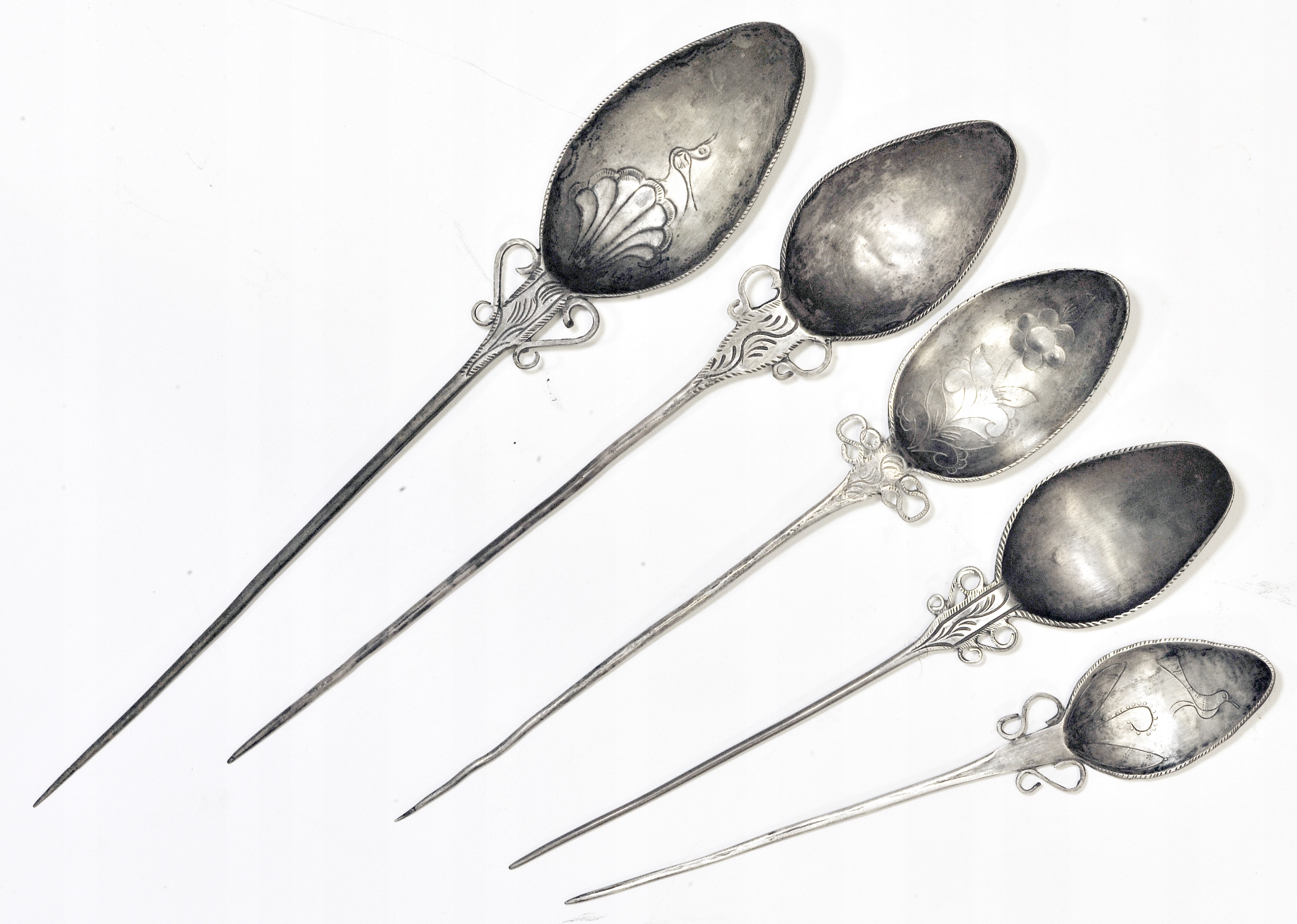 П'ять ложок з кованого срібла, ручки різьблені у вигляді загострених шампурів, з гравірованим переходом від ручки до черпака. У випадку з трьома ложками черпаки оздоблені в техніці репосажу з використанням рослинних і тваринних мотивів (птахів).