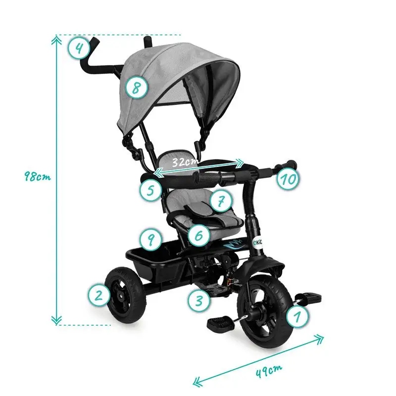 Дитячий триколісний велосипед з функцією керування на кермі за допомогою штовхаючої ручки, ідеальний для спільних прогулянок. Він захищає малюка від сонячного випромінювання, а також зручний і безпечний. Тому це чудова альтернатива колясці.