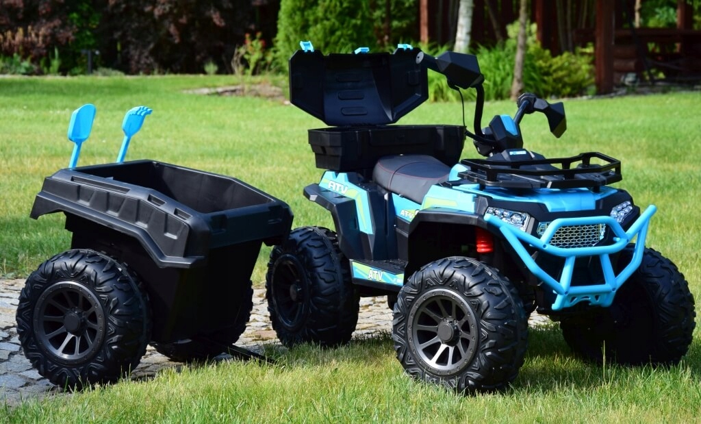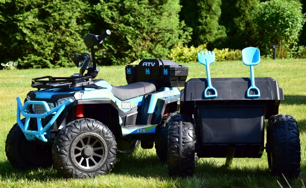 Quad Force Power ATV 900 з причепом, ідеально підходить для продовження пригод на квадроциклах, остання модель із приводом 4×4, дроселем і дистанційним керуванням для батьків. 4 потужні двигуни 4x150W і подвійна 2x батарея 12V9Ah (встановлення 24V/9Ah!). Червоний колір. Версія з трейлером.