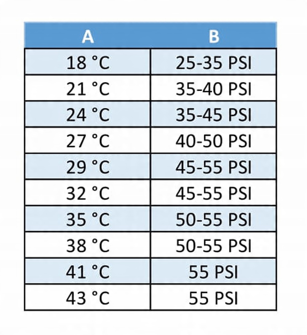 Залежно від переважної температури на вулиці під час заповнення правильний тиск на манометрі може змінюватися. Це приклад таблиці температур. Звичайно, ми можемо встановити температуру нижче 18°C, але манометр показуватиме тиск нижче 25 PSI.