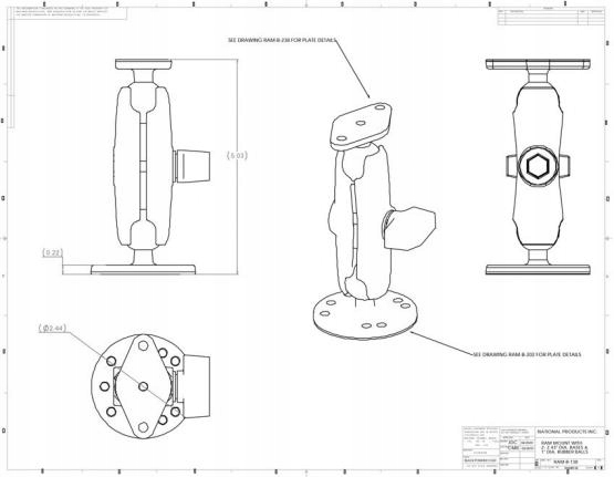 Рука довжиною 3,69 дюйма встановлена на плоскій поверхні з поворотною головкою. RAM-B-202U складається з гумової кульки діаметром 1 дюйм, з’єднаної з плоскою круглою основою діаметром 2,5 дюйма. Основа має попередньо просвердлені отвори. Поворотна головка дозволяє в широкому діапазоні регулювати положення ручки.