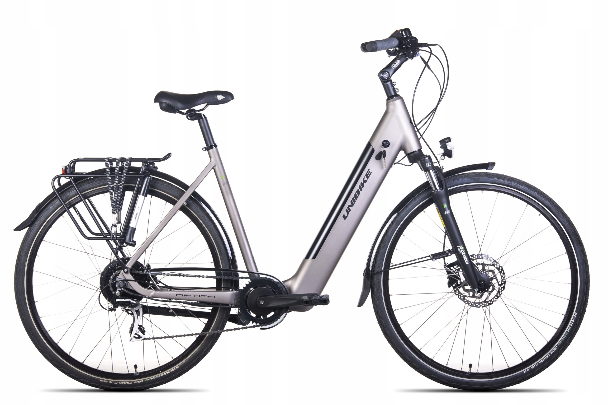 Електровелосипед Unibike Optima є чудовим вибором, який добре працюватиме в міських умовах і дозволить вам відкрити для себе принади велоспорту. Він вирізняється практичністю, завдяки використанню функціональних аксесуарів і відповідній геометрії рами забезпечує зручне вертикальне положення. Міцні алюмінієві компоненти, професійний електропривід і ретельно підібрані шини забезпечують ідеальне зчеплення в полі і на твердих поверхнях. Зручне положення дозволяє насолоджуватися їздою, як під час коротких поїздок, так і під час далеких поїздок на велосипеді з важким багажем.