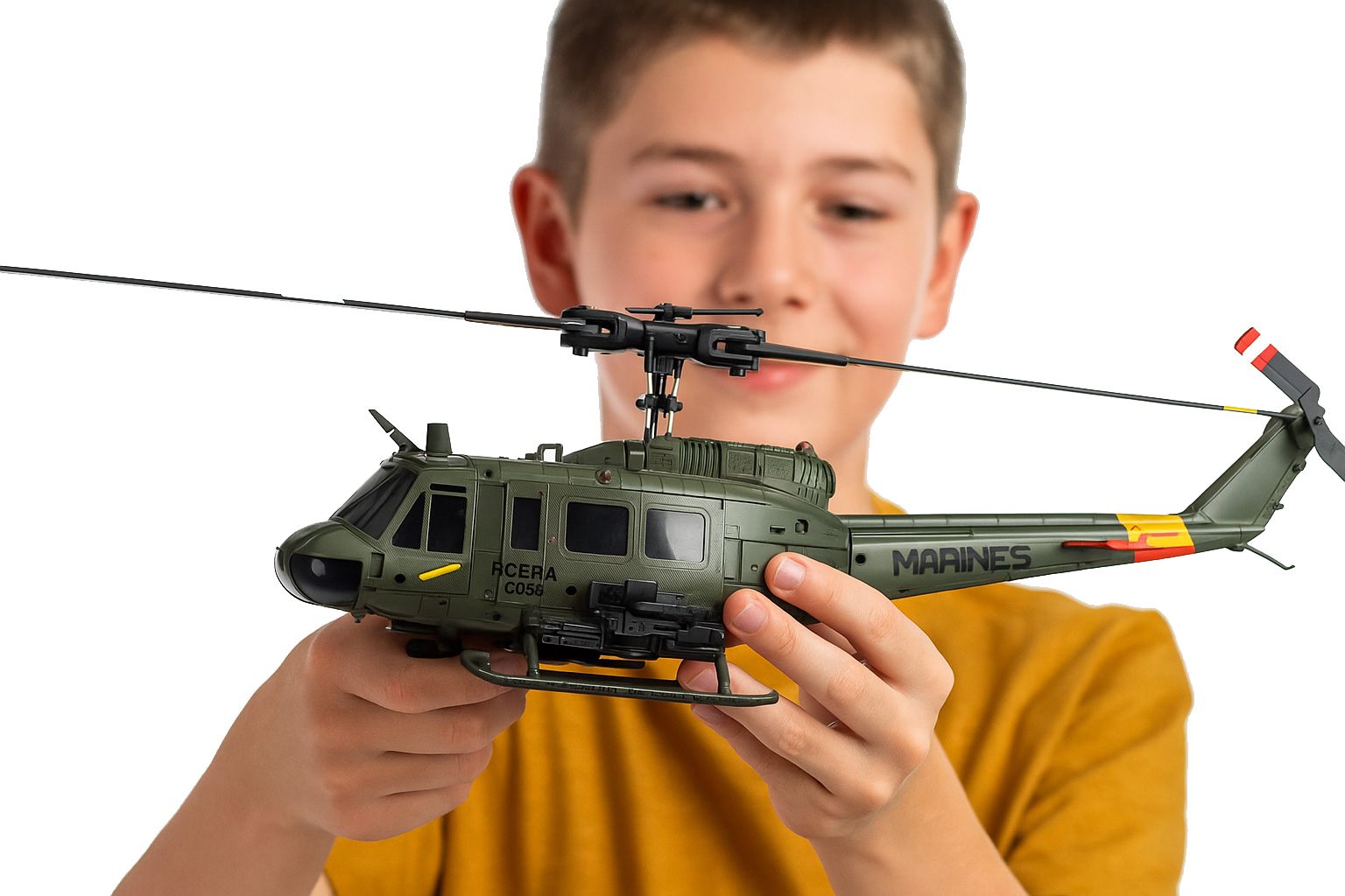 Ми представляємо дивовижну радіокеровану модель культового гелікоптера Bell UH-1 Iroquois, широко відомого як "Huey". Це не звичайна іграшка – це точно виготовлена копія в масштабі 1:48, яка поєднує військовий реалізм із новітньою технологією стабілізації польоту.