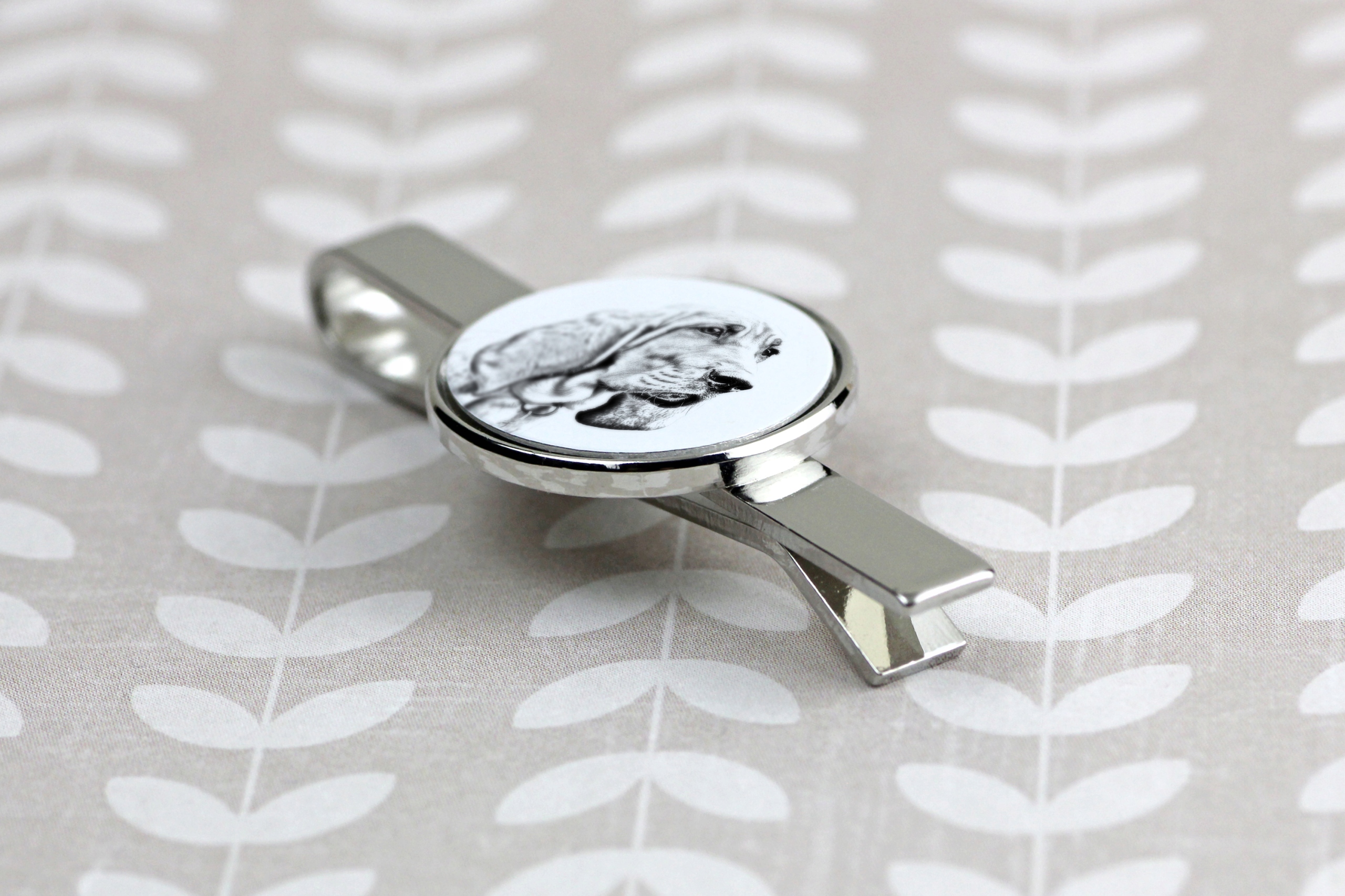 Затиск для краватки виготовлено з металу, який не змінює свого кольору з часом. Він прикрашений унікальною графікою, яку можна персоналізувати. Надішліть нам фотографію свого улюбленця, і ми роздрукуємо її та створимо унікальну прикрасу.