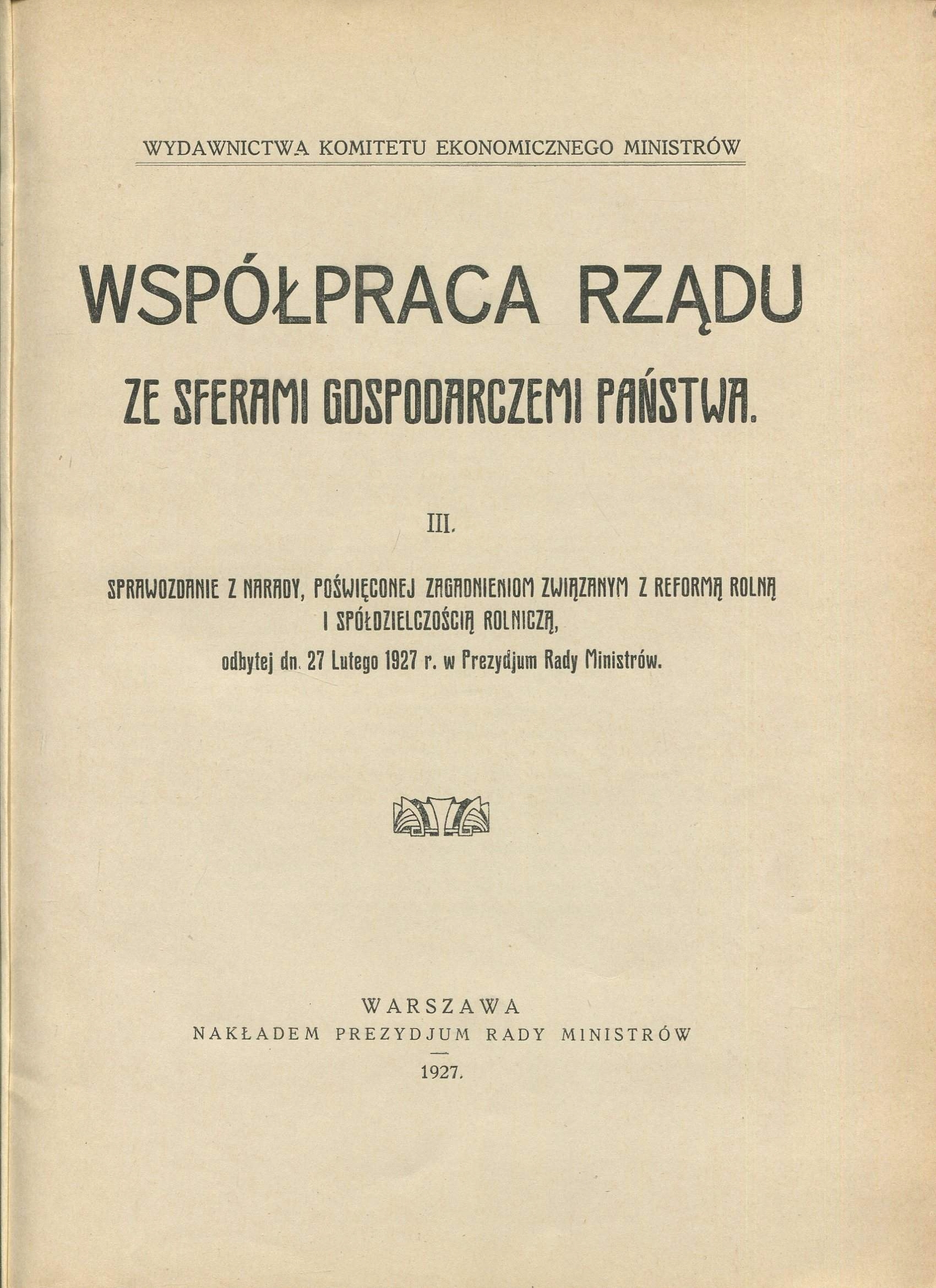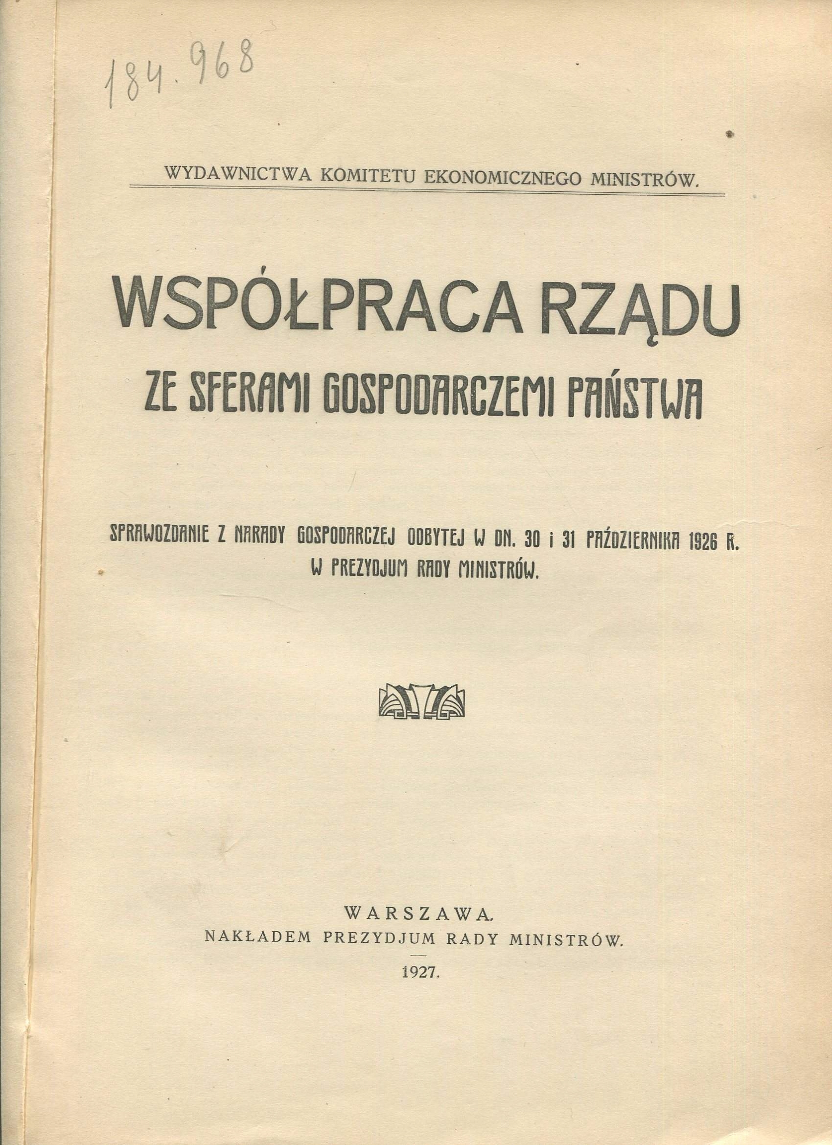 Видає Президія Ради Міністрів, Варшава 1927. Видавництво Економічного Комітету Міністрів.