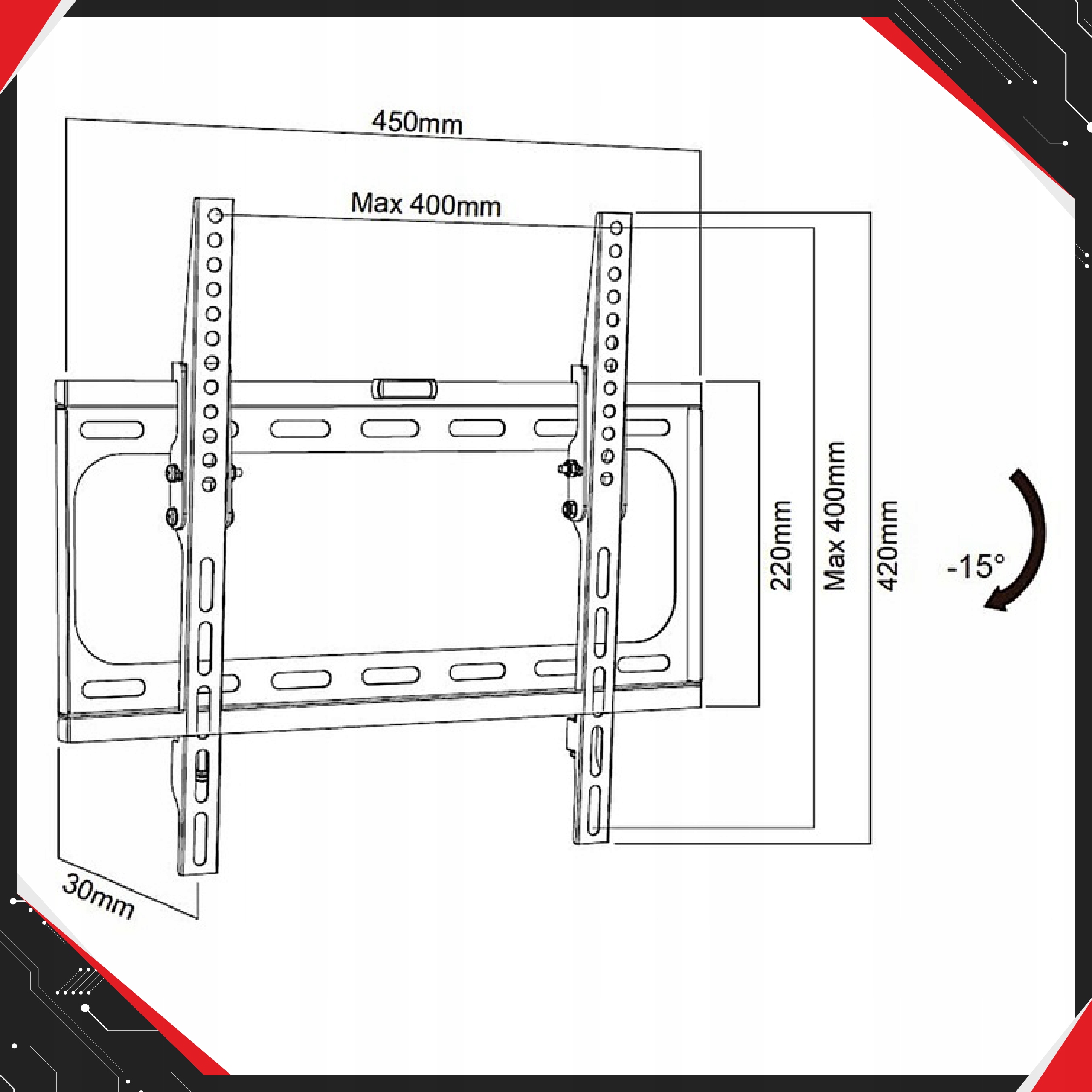 Пропонований тримач підходить для екранів (наприклад, телевізорів, моніторів) від 23” до 56” b>. Виготовлений зі сталі, тому відрізняється високою стійкістю і високим рівнем безпеки. Має рухомі ручкиі суцільну настінну плиту. Його кут нахилу регулюється в діапазоні від 0 до -15°.