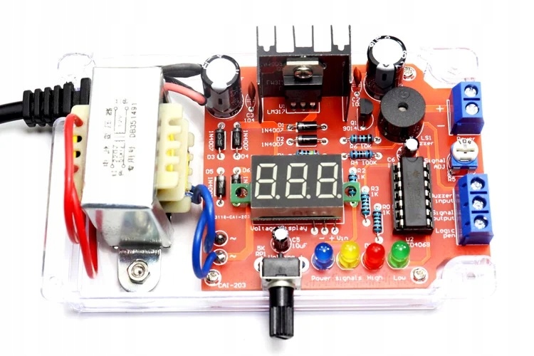живлення 1,25-12.5V з плавним регулюванням напруги, 200ma випускний струм, підходить для постачання невеликих ланцюгів. Сигнал проживання живлення, кабель підключений до зумер), а також може перевірити низькочастотний сигнал (вхід сигналу, якщо є сигнал, вмикатиме гудіння)