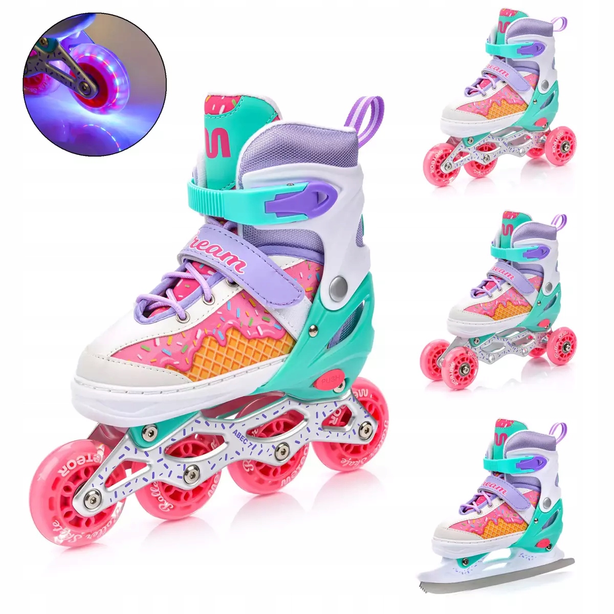 ковзани, ролики, роликові ковзани та валики в одному завдяки метеорному живописцю, яку ваша дитина буде активно проводити час, як влітку, так і взимку на крижаному костюмі - найкращий вибір, який має можливість коригувати розмір. Завдяки цьому ролики ростуть з дитиною, і вам не потрібно купувати нову пару кожні кілька місяців. Швидке і клопотне коригування буквально займає кілька секунд і дозволяє правильно встановити взуття відносно стопу дитини. Крижаний каток. Дизайн оболонки дозволяє рух і змінювати положення стопи під час руху, не втрачаючи жорсткості. Поліуретанові колеса гарантують дуже хороші параметри водіння. Крім того, оболонка, сильно побудована на задній частині, стабілізує щиколотку і запобігає травмам.