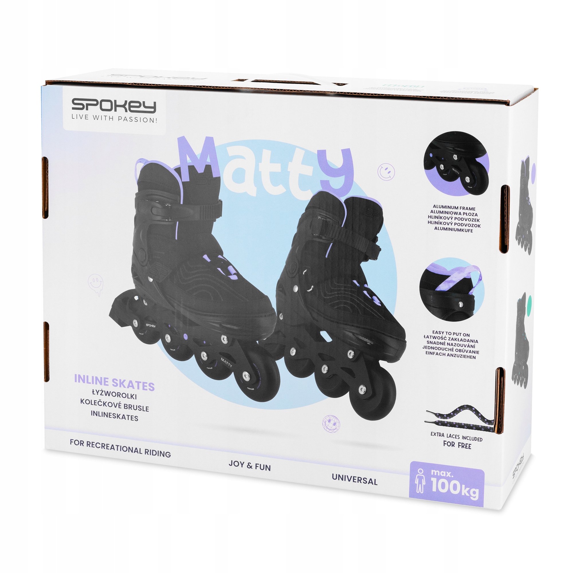 Рекреаційні роликові ковзани Spokey MATTY оснащені повністю матовими поліуретановими колесами (PU) o b>твердість 82Aз відмінною плавністю кочення, що дозволяє розвивати високі швидкості, зберігаючи відмінну міцність. Крім того, вони усувають і поглинають вібрації, що виникають при русі по нерівній поверхні. Карбонові підшипники ABEC-7 відповідають за плавність і швидкість руху. Все це встановлено на амортизаційні, міцні і в той же час легкі алюмінієві полози. Все це означає, що завдяки регульованим роликовим ковзанам Spokey MATTY ви відчуєте максимальний комфорт під час катання. Це модель, яку оцінять початківці та досвідчені любителі оздоровчої їзди. Але це ще не все! MATT містить дві пари шнурівок - стандартну та кольорову з принтом TIE-DYE.