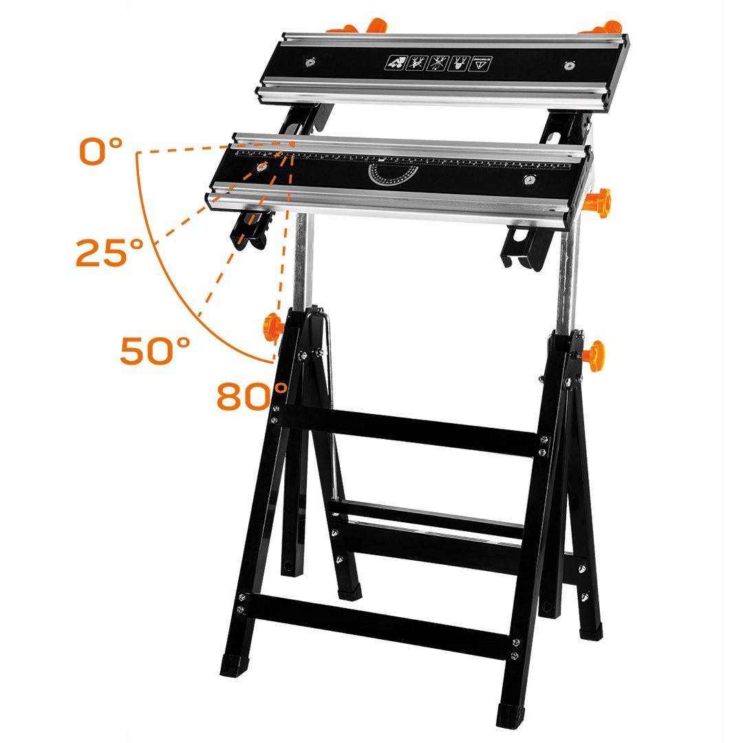 Регульований верстак, алюміній 60 x 59 x (77-107) см 44-700 від NEO Оснащений стільницею з 7-ступінчастим регулюванням висоти 77-107 см, зміною ширини та 4-ступінчастим кутом нахилу (0°, 25°, 50°, 80°). Виготовлений зі сталі з алюмінієвими профілями та покритий порошковою фарбою. Посилена металевими гвинтами, що направляють рухому частину верху. Пластикова ручка полегшує правильну позицію столу. Характеризується компактними розмірами в складеному вигляді (60 х 29 х 77 см). Має максимальне навантаження 100 кг. Пропонується в комплекті з 4 пластиковими затискними губками і крутним ключем. Рекомендовано для майстерень DIY та професіоналів.