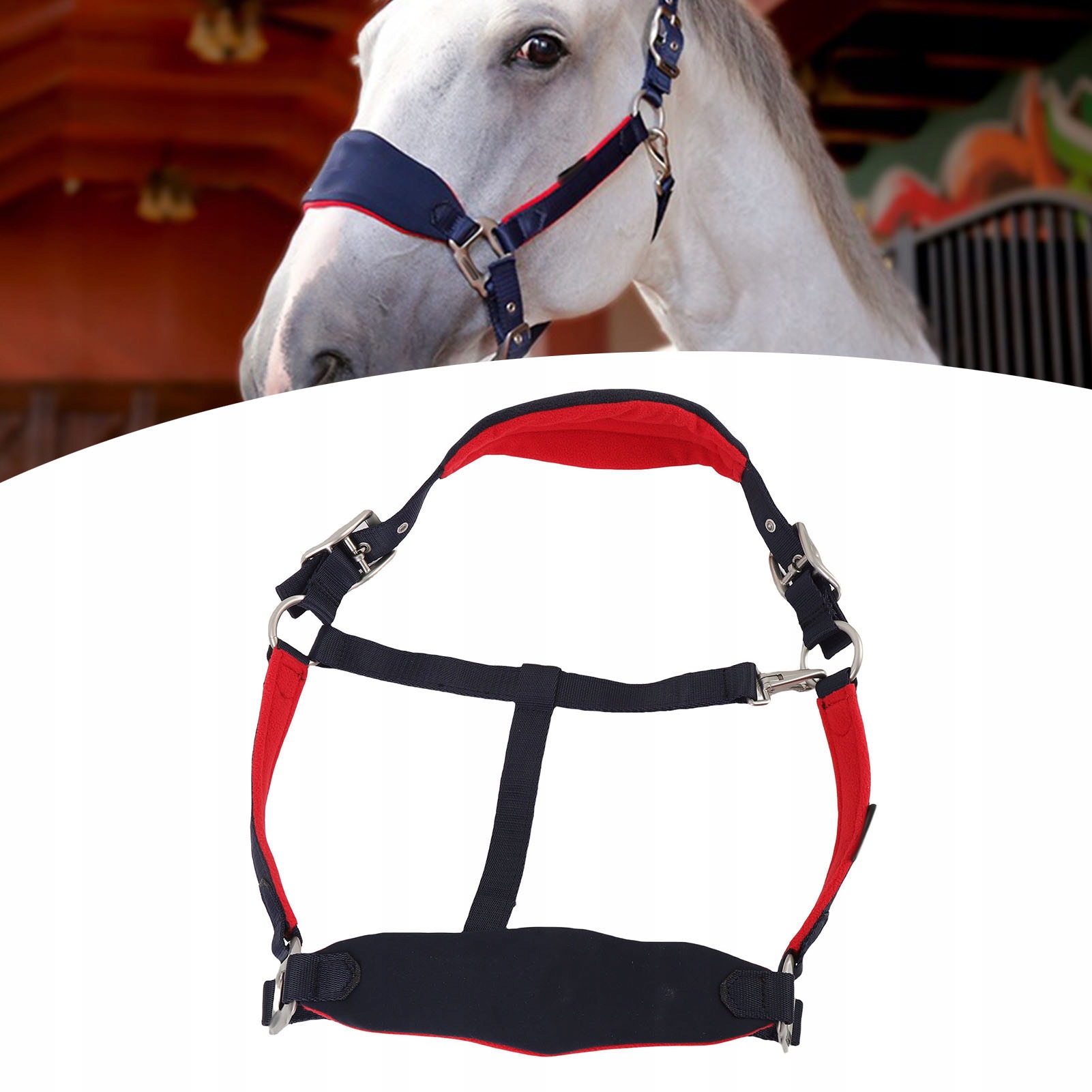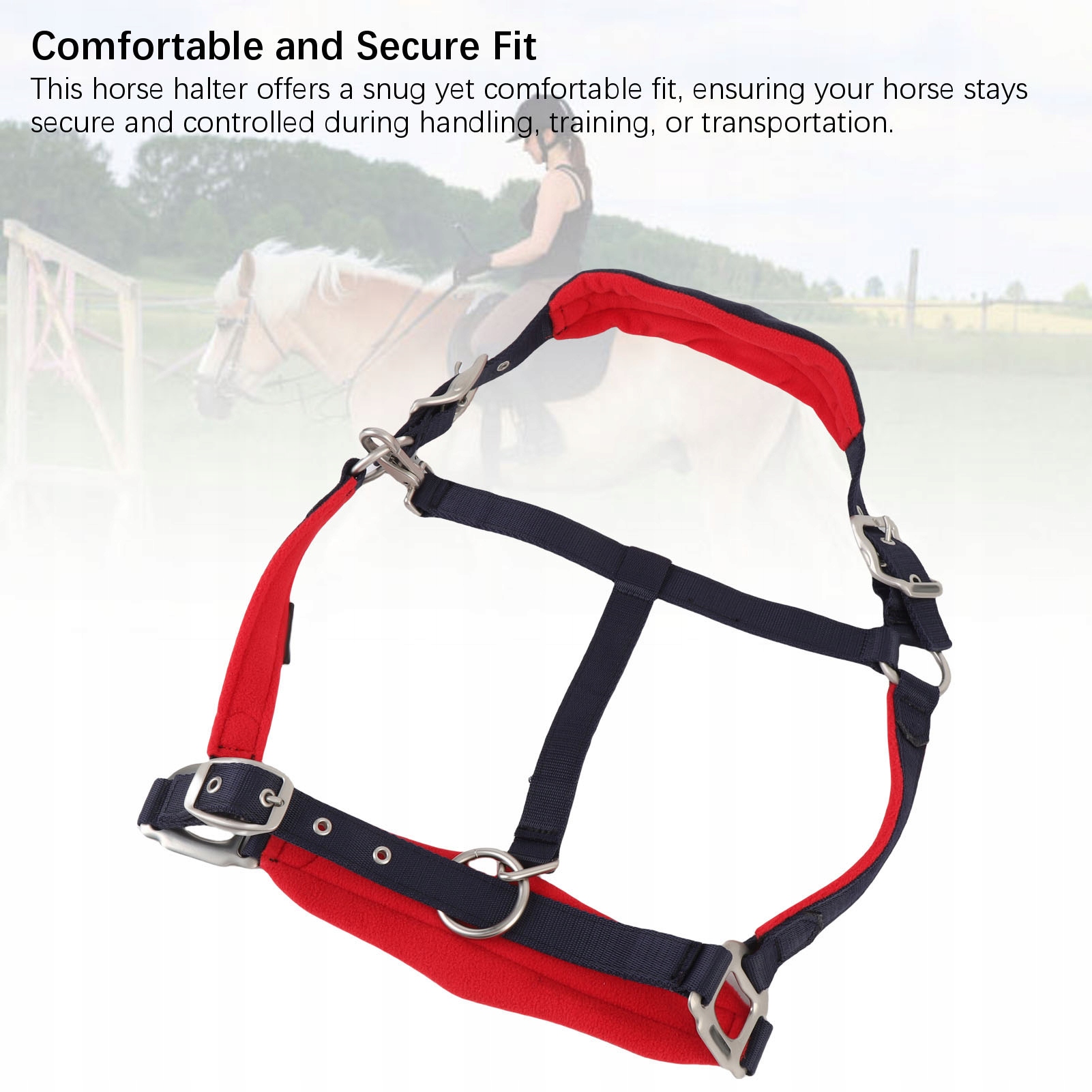2. Зручна та надійна посадка: цей недоуздок забезпечує щільну, але зручну посадку, забезпечуючи безпеку та контроль вашого коня під час поводження, тренування чи транспортування.