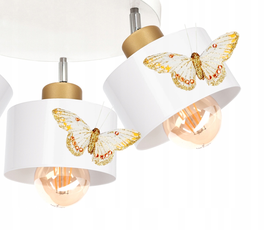Додатковою прикрасою світильника є 3 витончених золотих метелики (виготовлені чудово, виглядають реалістично). Метелики мають магніт, тому їх можна розмістити будь-де на лампі. Метелики виготовлені з легкого матеріалу, за структурою нагадують пташине перо. Завдяки цьому вони не становлять загрози для безпеки вашої дитини (у разі від'єднання від лампи).