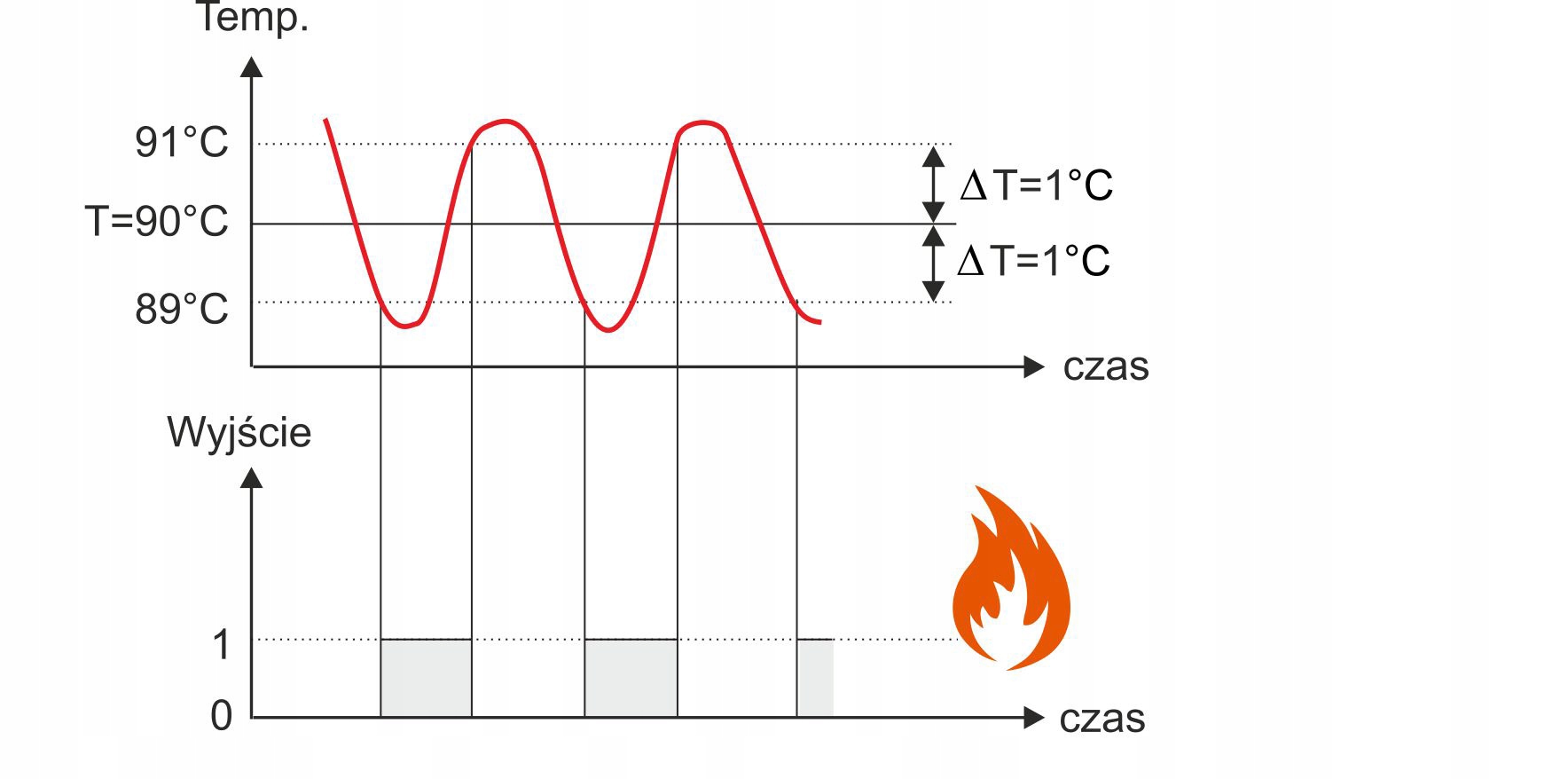 Контролер використовується для підтримки температури T із заданим гістерезисом T в холодильних або нагрівальних приладах. Привід керується через релейний вихід, а температура вимірюється за допомогою датчика температури.