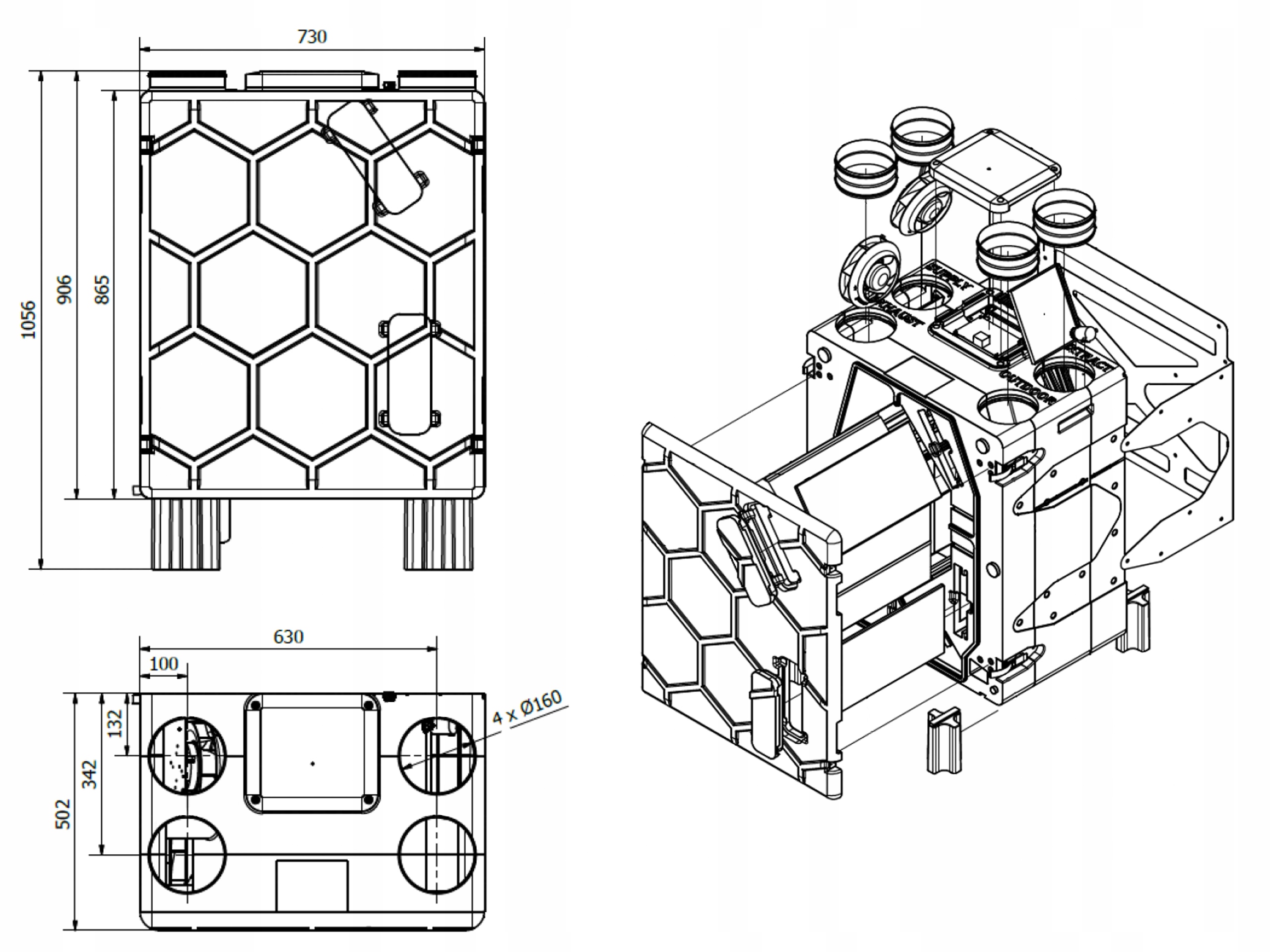 Конструкція агрегату виготовлена з міцного спіненого поліпропілену (EPP), який характеризується хорошими теплоізоляційними та акустичними властивостями, і, перш за все, малою вагою, що робить блок легким порівняно з іншими рекуператорами. У пристрої використовується протиточний обмінник з алюмінію та енергозберігаючі ЕС-вентилятори з високим тиском 1000Па. Крім того, дизайн вирізняється змінними портами підключення та модульованим байпасом. Установка також оснащена 4 датчиками температури (приплив, витяжка, витяжка, зовнішня температура), опціонально рекуператор може бути оснащений датчиками CO2 і RH, які додатково виконують роль контролерів.