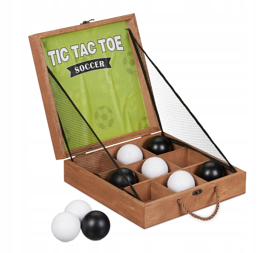 Емблематична стратегічна гра Tac-Ta-Toe у захоплюючій версії для кидання! Гра доставляється в практичній коробці, що робить її ідеальною для подорожей. Щоб грати, просто відкрийте коробку і киньте кульки на поле 3x3. Ті, хто любить експериментувати, також можуть спробувати кинути кульки в коробку. Людина, яка вперше потрапила в 3 м'ячі поспіль, виграє. Гра на свіжому повітрі пропонує чудову розвагу для дітей та дорослих.