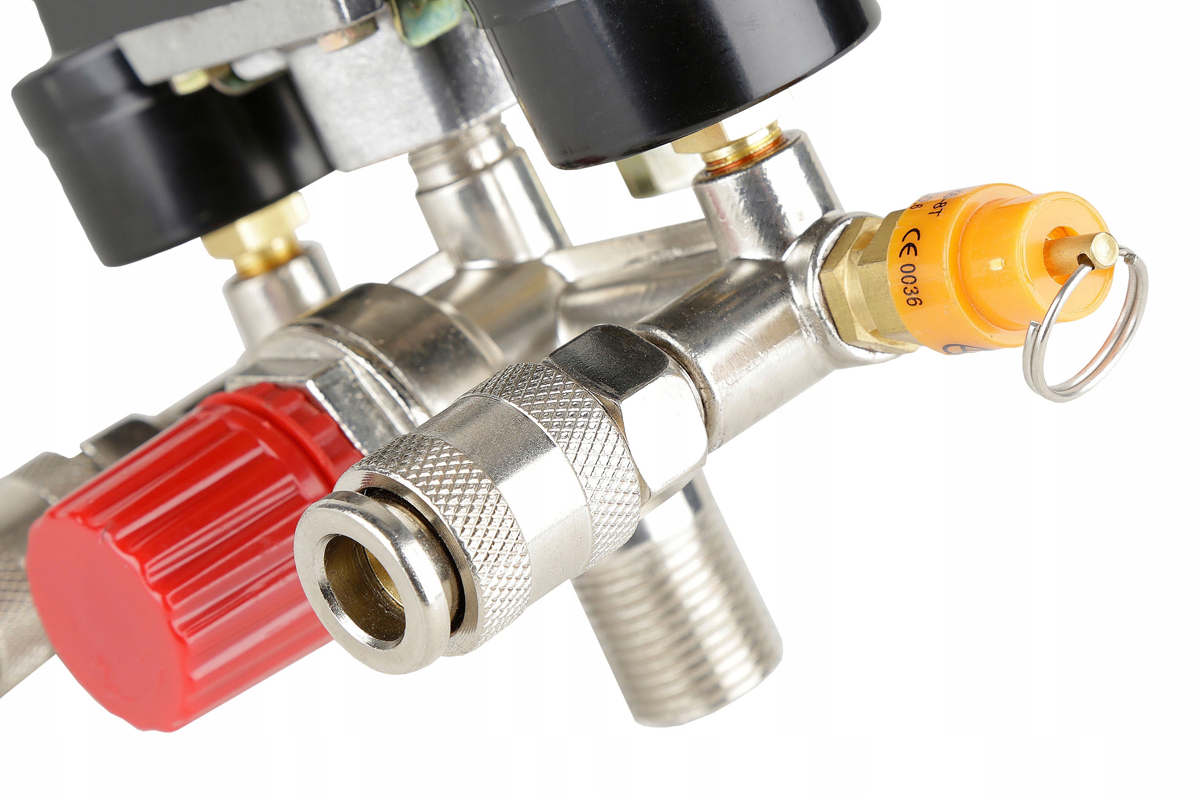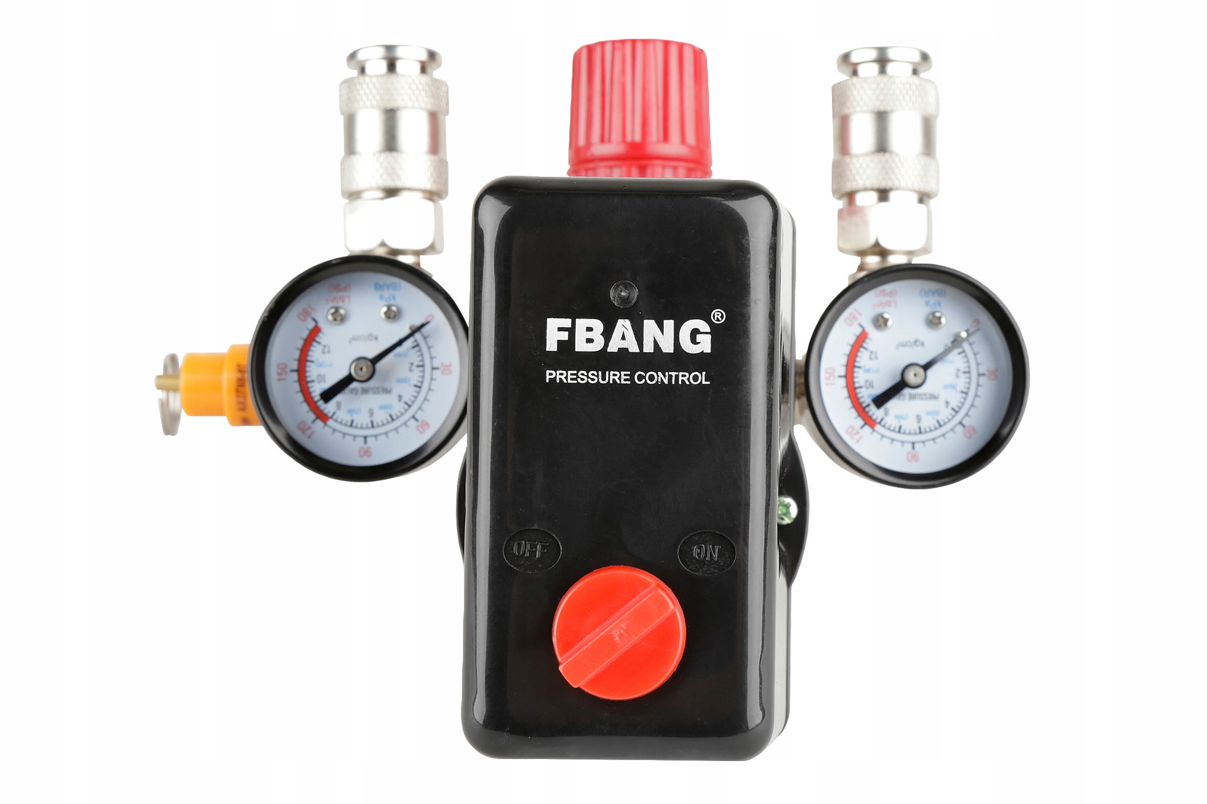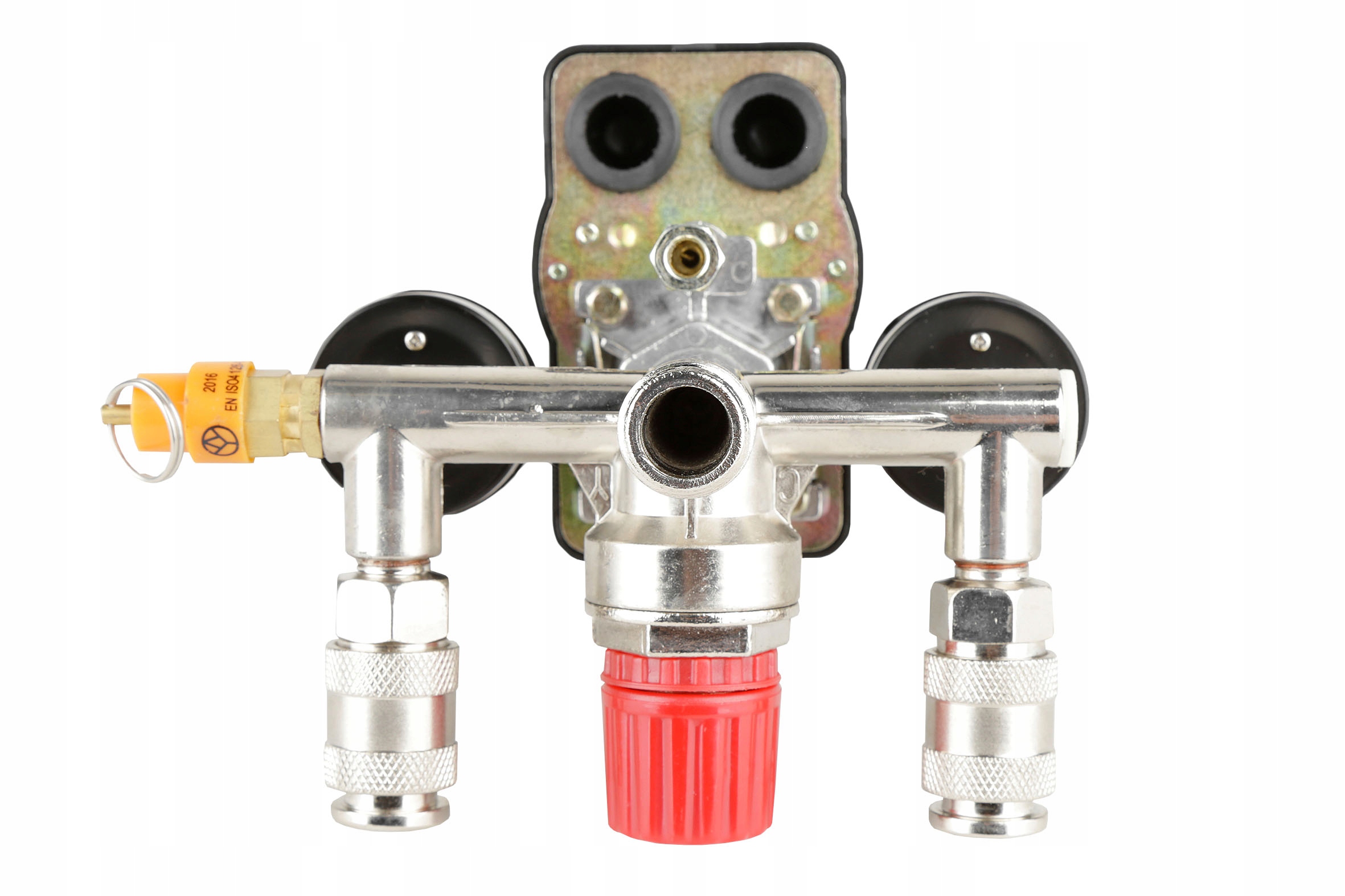 Реле тиску (реле тиску) з редуктором, колектором, двома швидкознімними з'єднувачами і манометрами призначене для компресорів різних виробників з живленням 400В. Пропонований перемикач є універсальною запчастиною, призначеною для компресорів, переважно з більшими баками (100, 120, 150, 200, 250, 500л). Вимикач має клапан, який полегшує запуск компресора - він скидає тиск з нагнітального колектора. Тиск у резервуарі підтримується зворотним клапаном, налаштованим на максимальний робочий тиск 8 бар. Конструкція реле тиску дозволяє йому працювати при тиску до 12 бар, що означає, що після заміни запобіжного клапана на реле тиску більшого розміру його можна використовувати для роботи компресорів з високим робочим тиском.