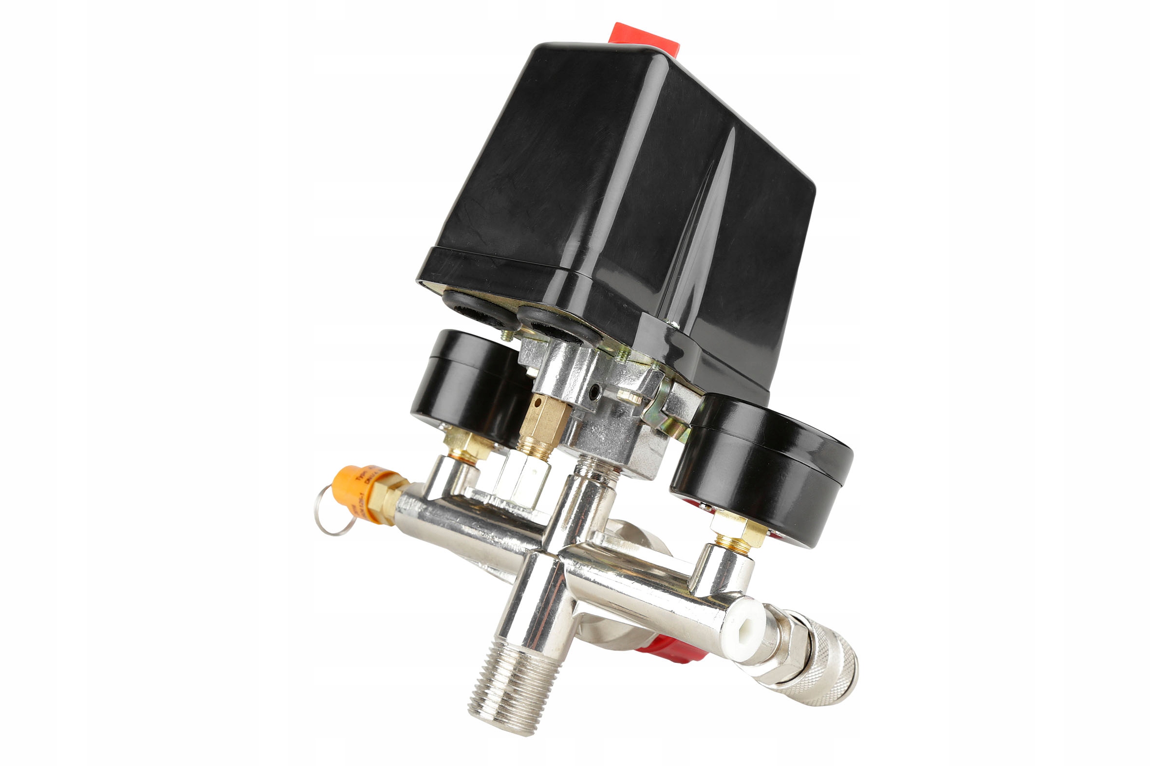 Корпус пристрою виготовлений з надзвичайно міцного пластику, стійкого до механічних пошкоджень і зношування. Принцип роботи перемикача надзвичайно простий, і його робота складається з одного перемикача і регулювального гвинта, розташованого всередині пристрою. Перемикач автоматично вимикає компресор при досягненні максимального тиску в баку. Після використання стисненого повітря і зниження тиску до заданого значення, вимикач автоматично включає компресор, який повністю заповнює бак. Регулювальна гайка розташована під верхнім корпусом і дозволяє легко регулювати момент запуску компресора (менше або вище тиск в баку). Реле тиску також використовує редуктор, який використовується для зниження тиску на одному швидкому з’єднанні. Регулювання плавне і точне, заданий тиск відображається на манометрі. Пропонований елемент є комплексним рішенням, готовим до встановлення та використання.