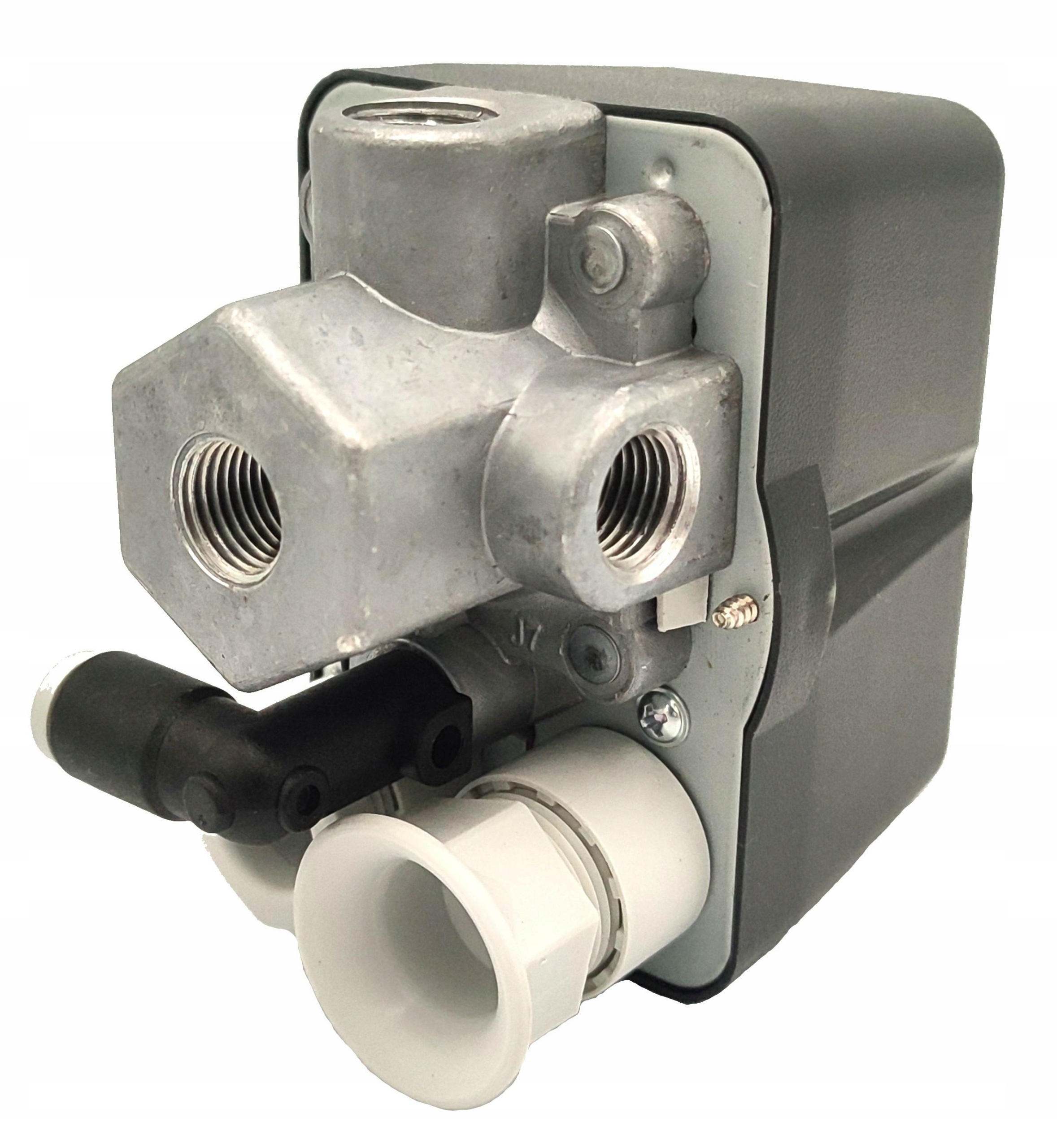 Реле тиску має чотири внутрішні з’єднання. Нижня різьба для кріплення на баку компресора та бічні різьби, до яких ви можете прикріпити додаткові елементи відповідно до ваших потреб - напр. манометр, швидкі з'єднання, редуктор, запобіжний клапан.