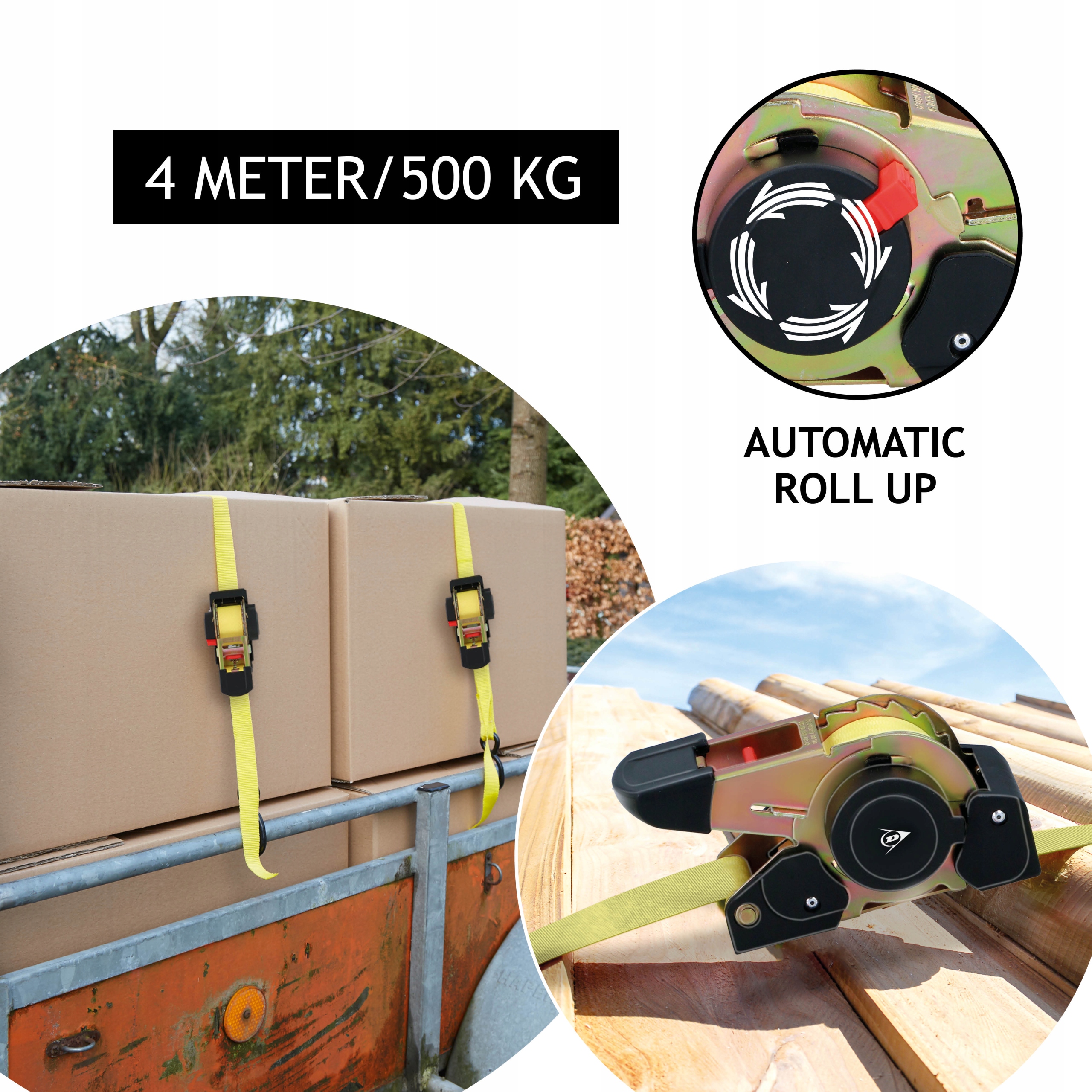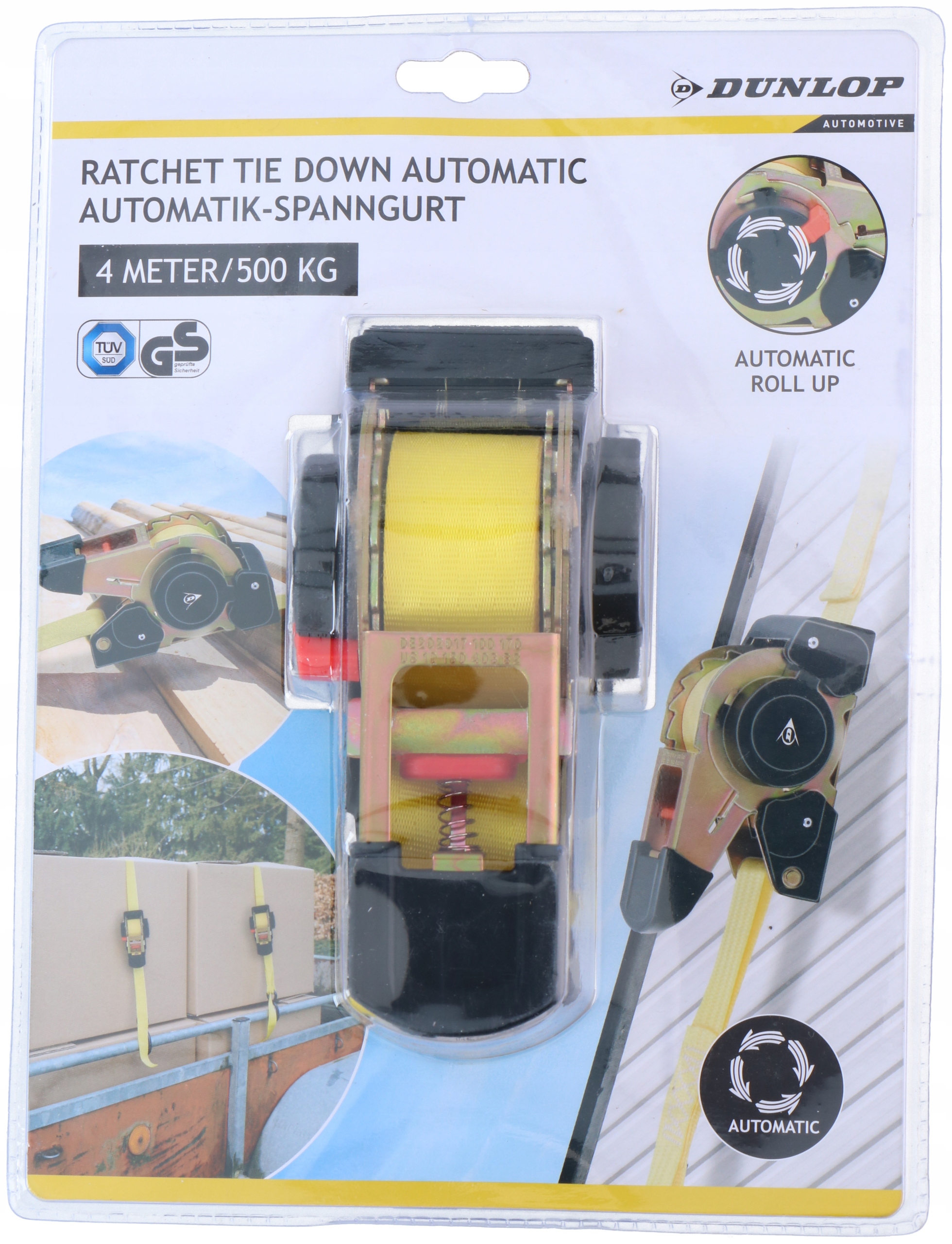 Кріпковий ремінь Dunlop з автоматичним натягувачемвикористовується для фіксації вантажу та запобігання його зсуву. Пояс виготовлений з нейлону, що робить його надзвичайно міцним. Ремінь оброблений суцільними металевими гачками.