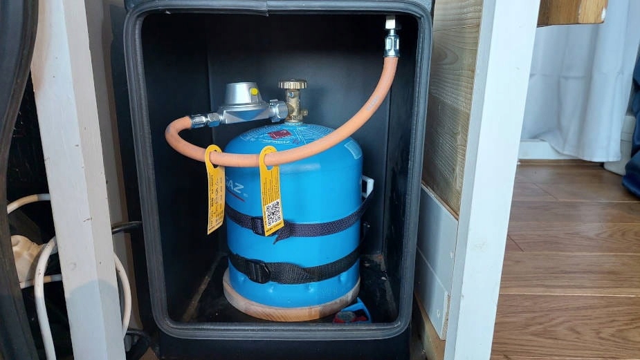 Тримач для балонів 5 кг і 11 кг, виготовлений з морозостійкого пластику (до -40 °C), газовий балон просто кріпиться за допомогою ременя (120 см).