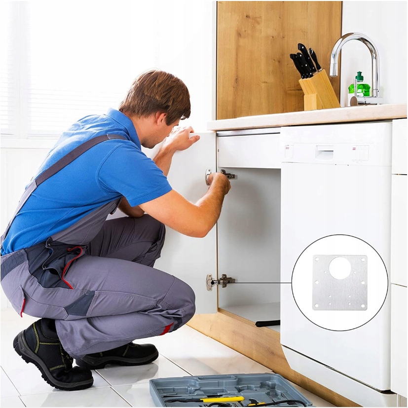Універсальна пластина для ремонту петлі. Завдяки численним отворам він підійде для більшості меблів. Виріб універсальний як для лівої, так і для правої сторони петлі. Крім того, ми додаємо гвинти, щоб легко та швидко відремонтувати петлю та вирішити проблему.