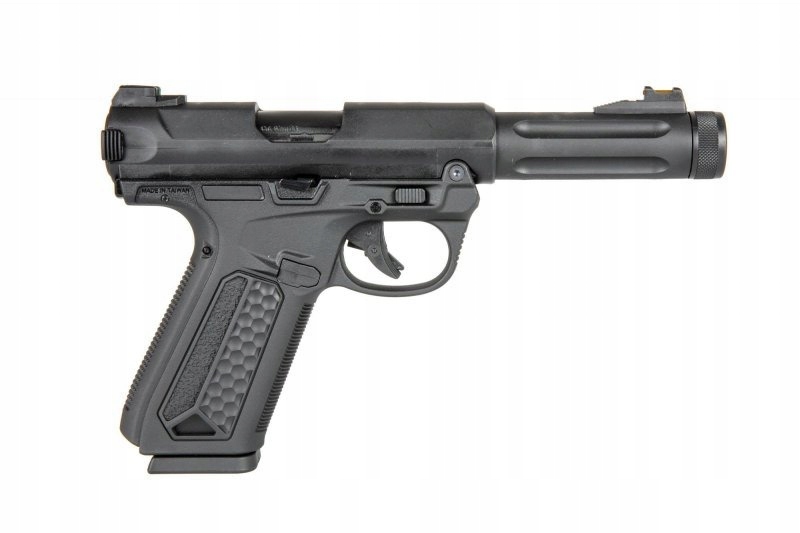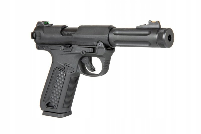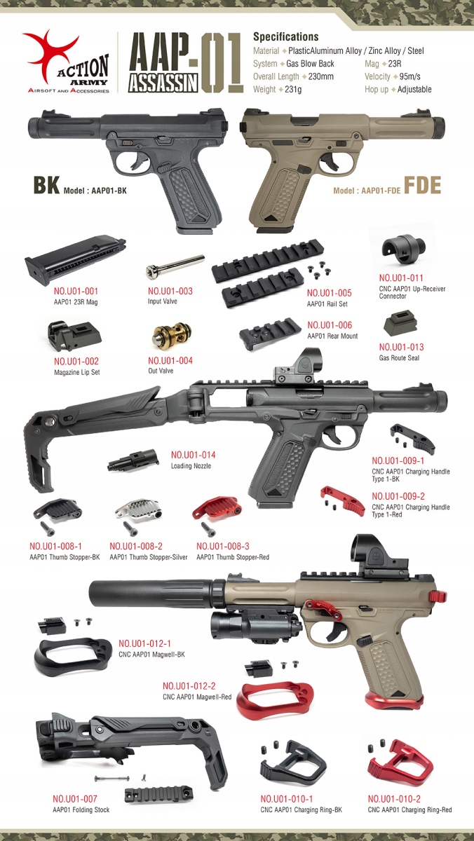 AAP01 Assassin — газова страйкбольна рушниця, виготовлена з міцного полімеру, армованого скловолокном. Замок, внутрішній ствол, магазин і дрібні деталі виготовлені з металу. Замок виготовлений із сталі. Використання полімеру у виробництві репліки робить AAP01 Assassin без магазину вагою лише 380 грамів, що робить його одним із найлегших пістолетів на ринку. Великою перевагою дизайну Action Army є його сумісність з магазинами, призначеними для реплік пістолетів Glock. Пістолет Action Army оснащений стандартною лівою різьбою 14 мм, завдяки якій ми можемо використовувати широкий спектр глушників і компенсаторів звуку для страйкболу. AAP01 Assassin — це копія з оригінальним зовнішнім виглядом, до того ж він легкий, зручний і приносить багато задоволення від стрільби.