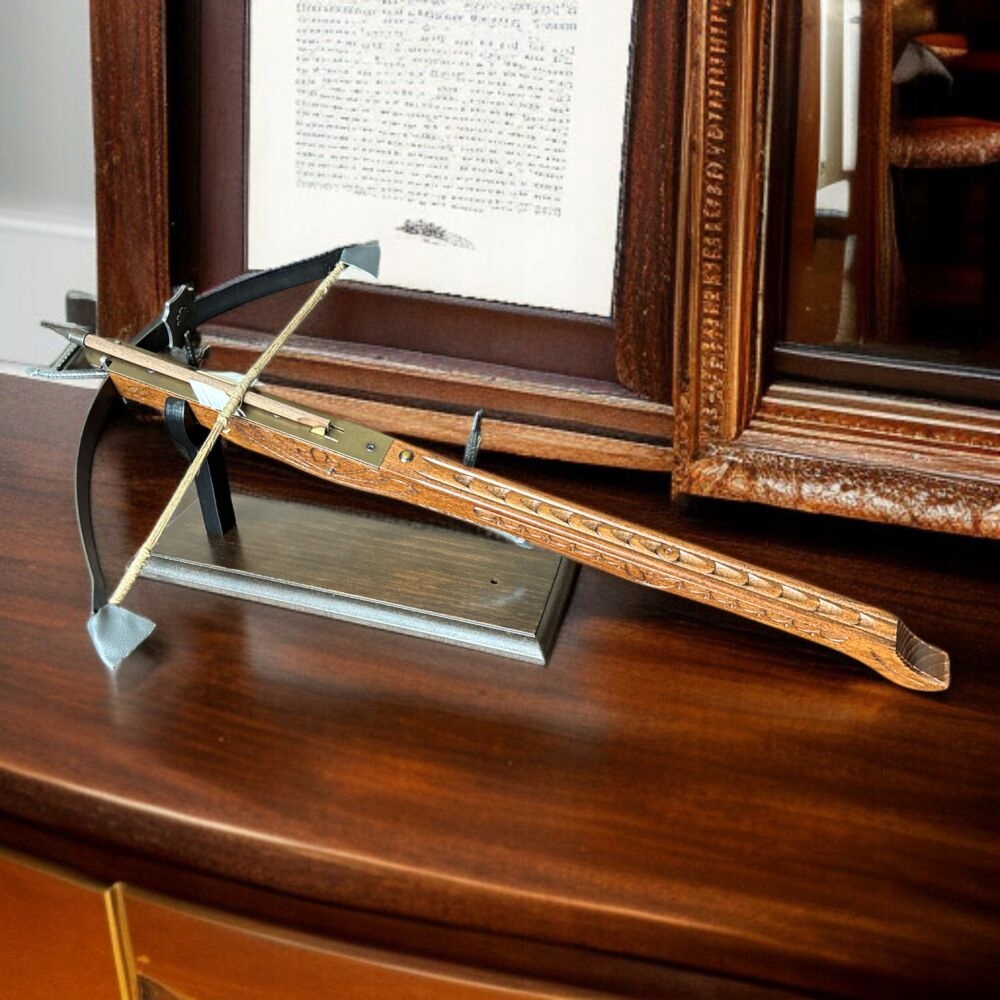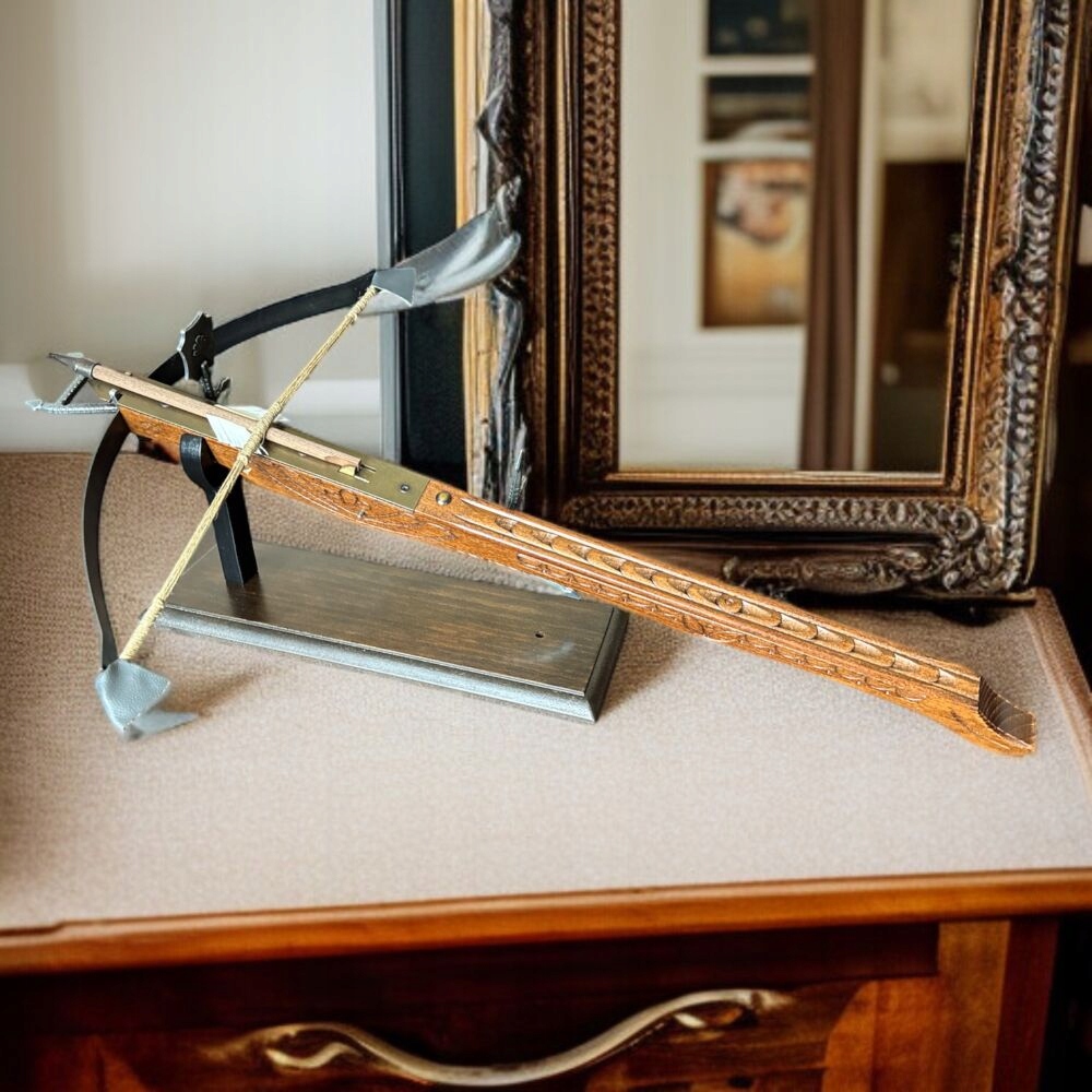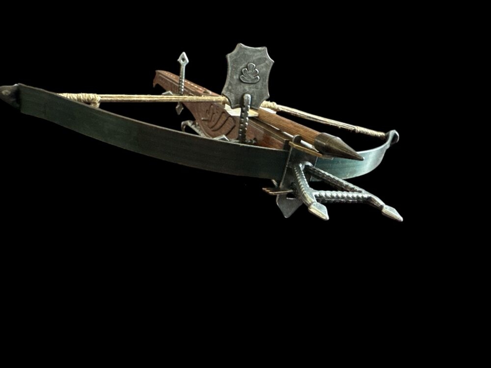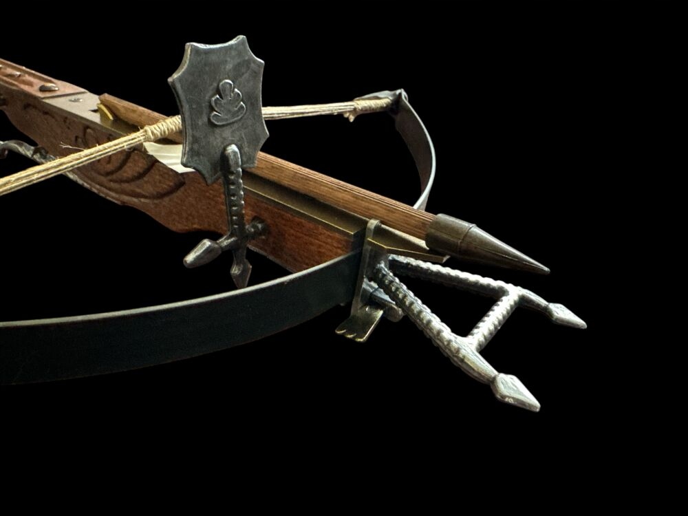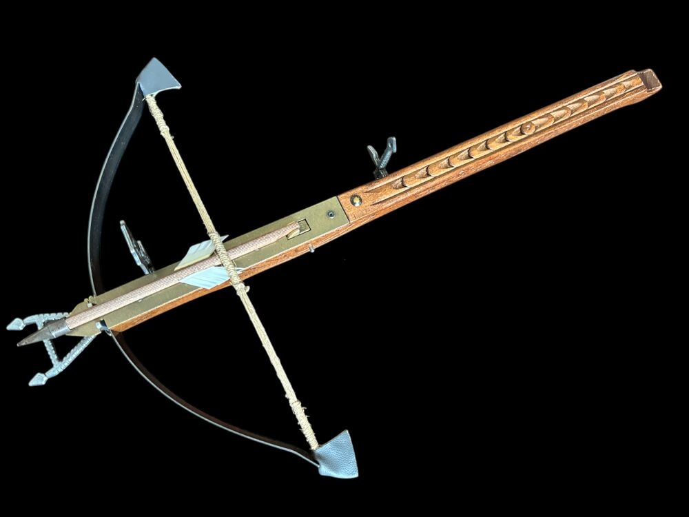 Вірна копія середньовічного лицарського арбалета була виготовлена з дерева та сталі. Затвор має менший радіус і масивніший, ніж у стріли з лука. Після пострілу затвор обертався навколо власної осі завдяки елеронам. Дулова енергія в 3,3-10 разів перевищувала енергію стріли лука. Початкова швидкість становила 150 м/с, а максимальна дальність – 400 метрів.