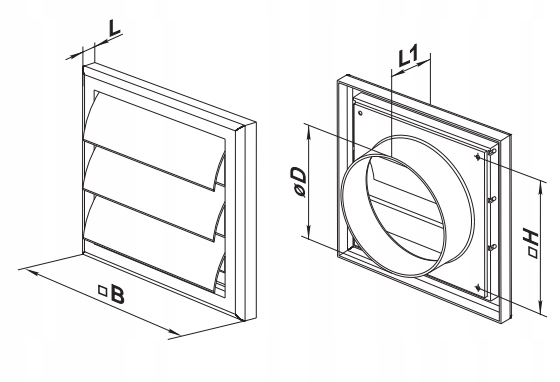 РЕШІТКИ ЗОВНІШНІ МВ 100 ВЖ використовуються як зовнішнє завершення випуску (вентиляційного каналу). Вони виготовлені зі стійкого до ударів та УФ-променів АБС-пластику. Відповідна конструкція решітки, оснащена жалюзі, що автоматично закриваються, забезпечує потік повітря тільки в одному напрямку (запобігає зворотному потоку повітря у вентиляційний канал). Ґрати можна використовувати на відкритому повітрі на вертикальних поверхнях для громадської, житлової та промислової вентиляції.