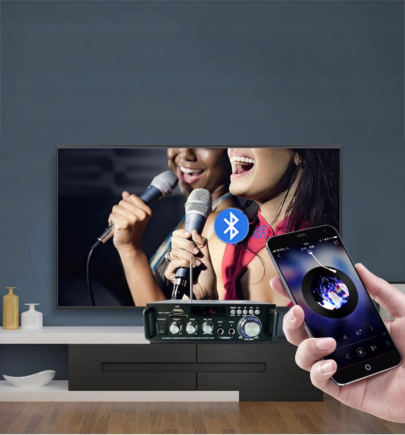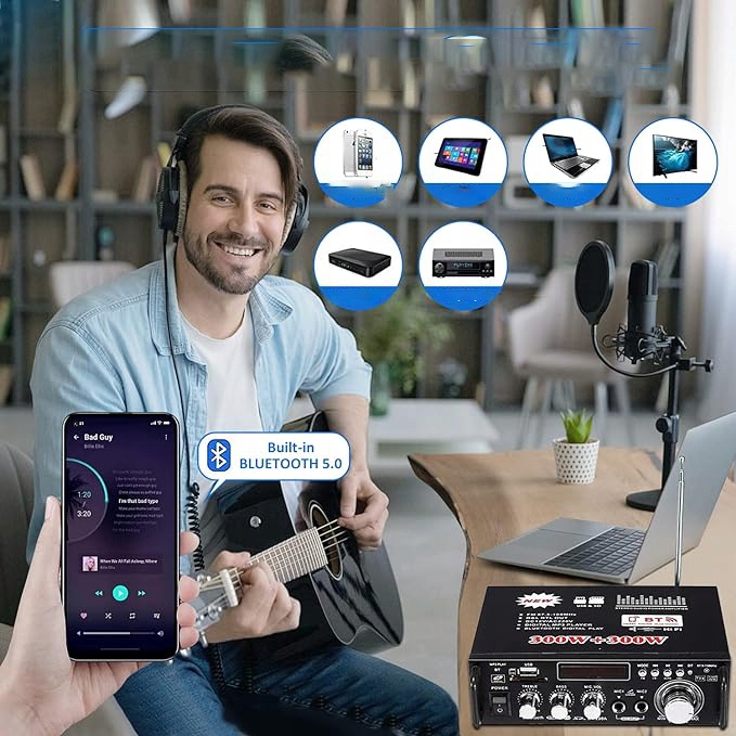 - Міні-підсилювач, підсилювач HiFi, стереозвук Bluetooth 5.0, 12 В 220 В 600 Вт, 2 канали, РК-дисплей, висока якість, портативне FM-радіо, слот для карти SD/USB, для дому чи автомобіля -