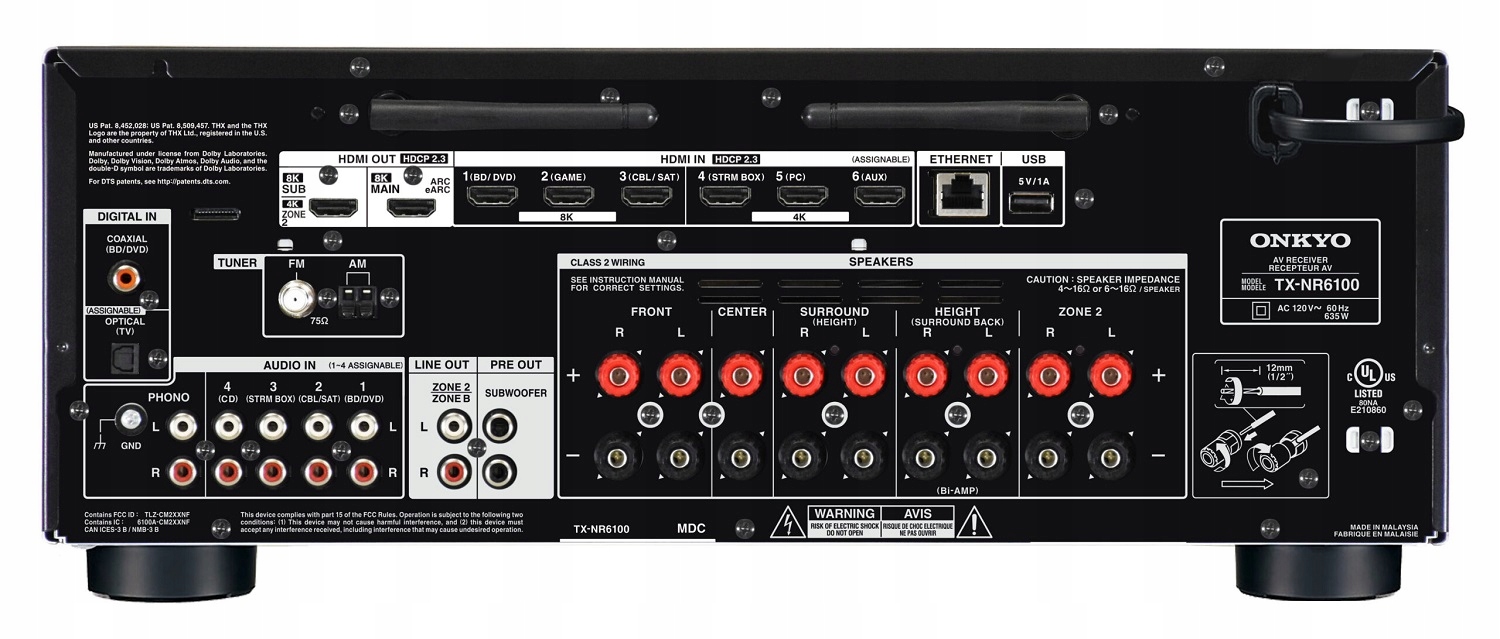 - 9 терміналів динаміків (включаючи виділені термінали Zone 2); підготовлено для бананових штекерів