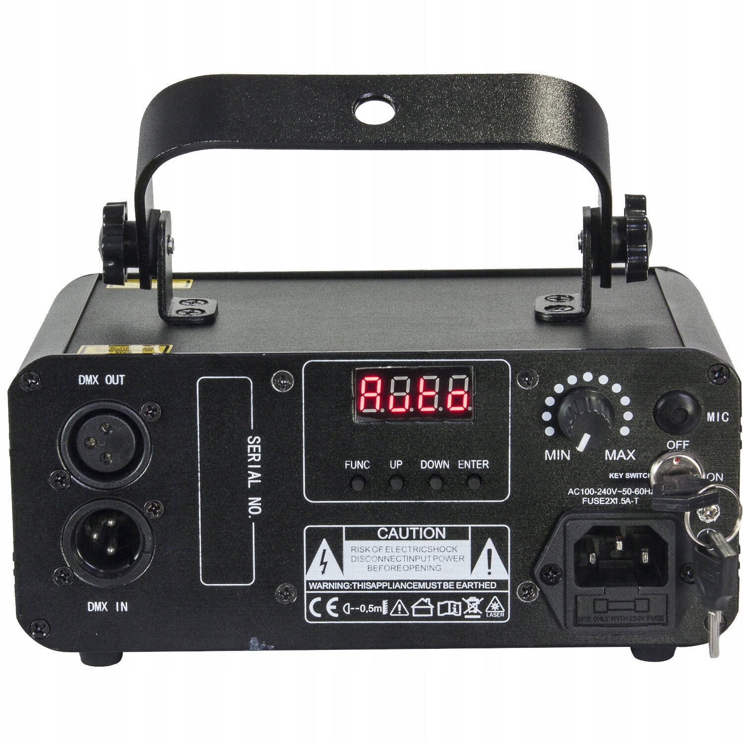 Потужний лазер потужністю 430 мВт, оснащений трьома лазерними діодами (по одному на колір), яким можна керувати через DMX або за допомогою пульта дистанційного керування, що входить у комплект. Усі три світлодіоди працюють разом, створюючи яскраві різнокольорові ефекти, які вразять аудиторію. Цей світловий ефект включає 21 готове світлове шоу, а також 128 фіксованих візерунків і три еволюційні візерунки; автоматичні світлові шоу дозволяють залишати світло включеним для виконання попередньо запрограмованих програм.