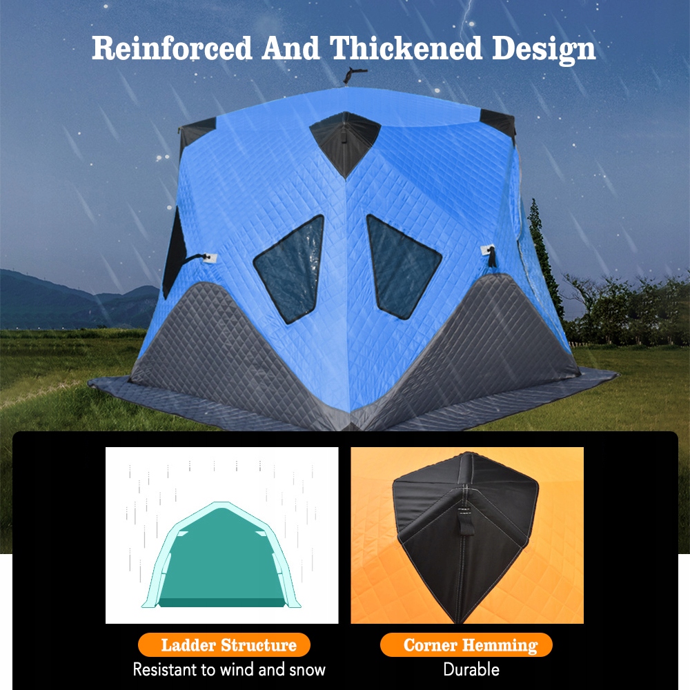 - Цей намет для зимової риболовлі на 3-4 особи легко відкривається та висувається автоматично. Він теплий і вітронепроникний, міцний і щільний, має великий простір.