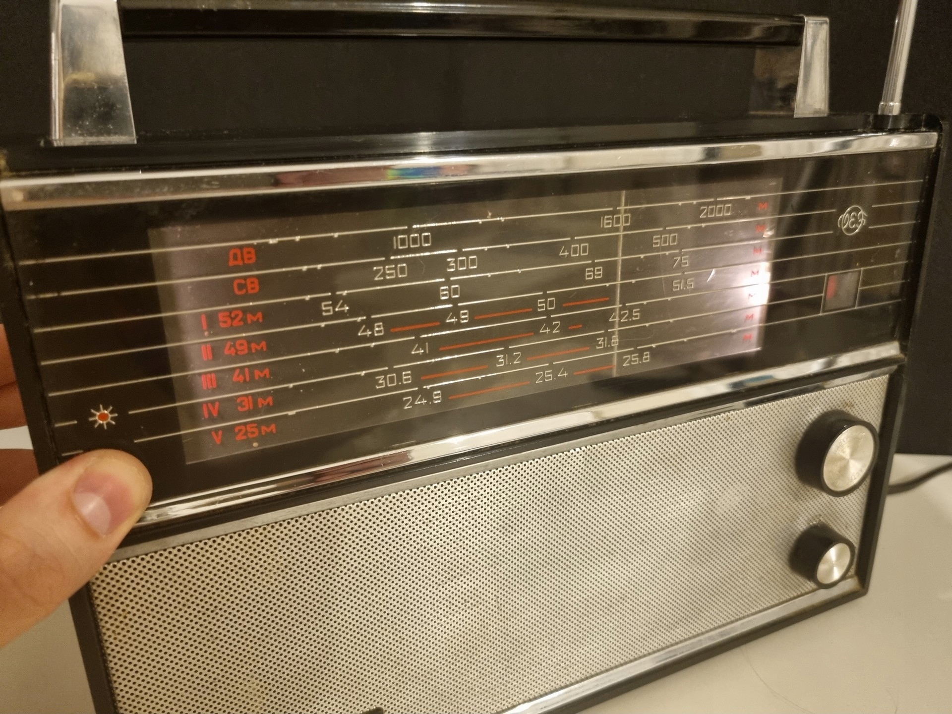 Справна, ловить різні іноземні станції. Антена і ручка цілі.