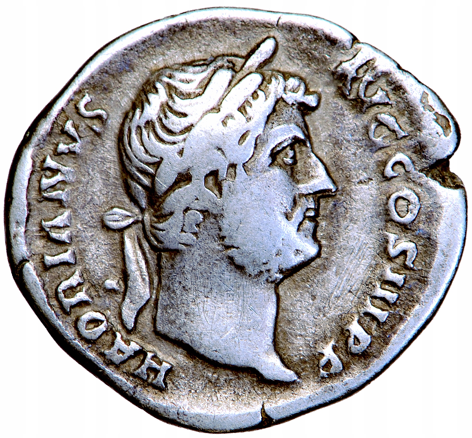 Av. HADRIANVS - AVG COS III P P, голова імператора в лавровому вінку праворуч.