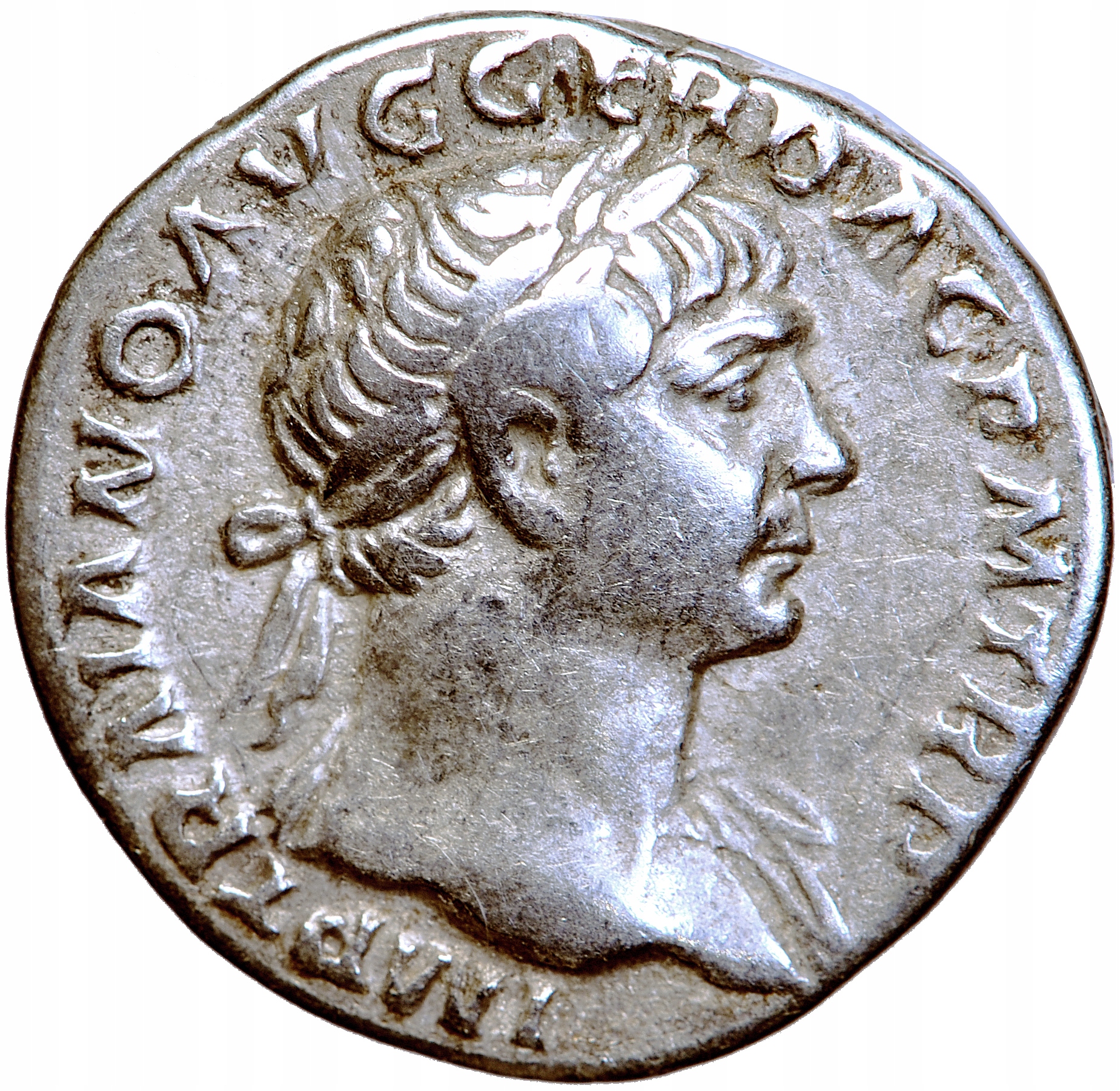 Av. IMP TRAIANO AVG GER DAC P M TR P, бюст імператора в лавровому вінку праворуч, драпірування на дальньому плечі.
