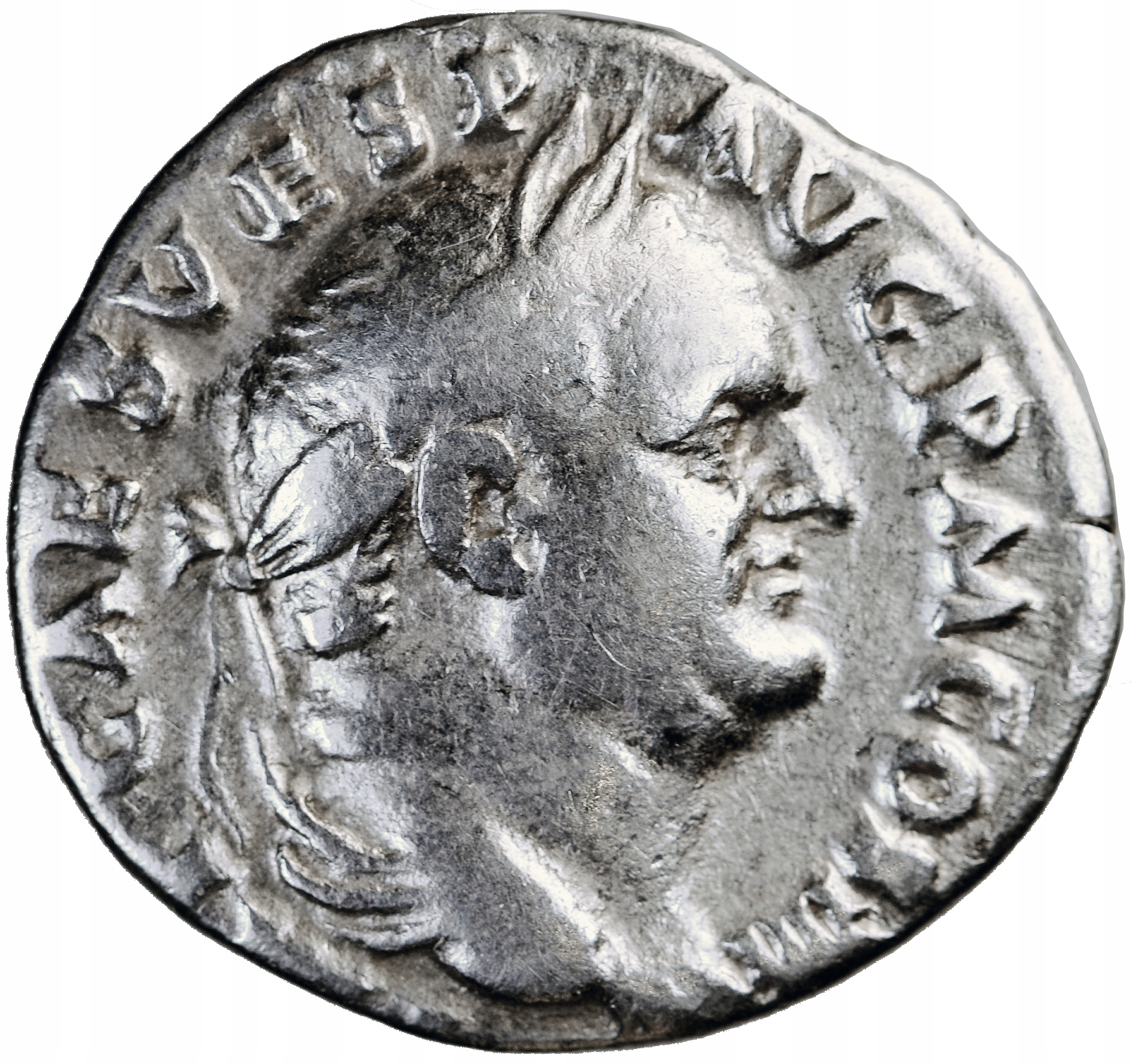 av. IMP CAES VES-P AVG P M, голова імператора в лавровому вінку праворуч. AVGVR, Священицькі аксесуари: Simpulum, Aspersorium, Capis та Lituus, Tri Pot - в епізоді. RSC 43; BMC Re.50 PL. 1/18.