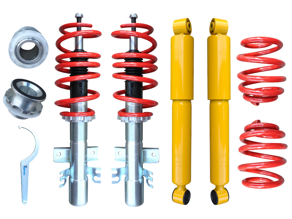 В комплекті 2 різьбових амортизатора, 4 спортивних пружини, задні амортизатори, регулювальні втулки . задня частина, ключ регулювання висоти та сертифікат TUV